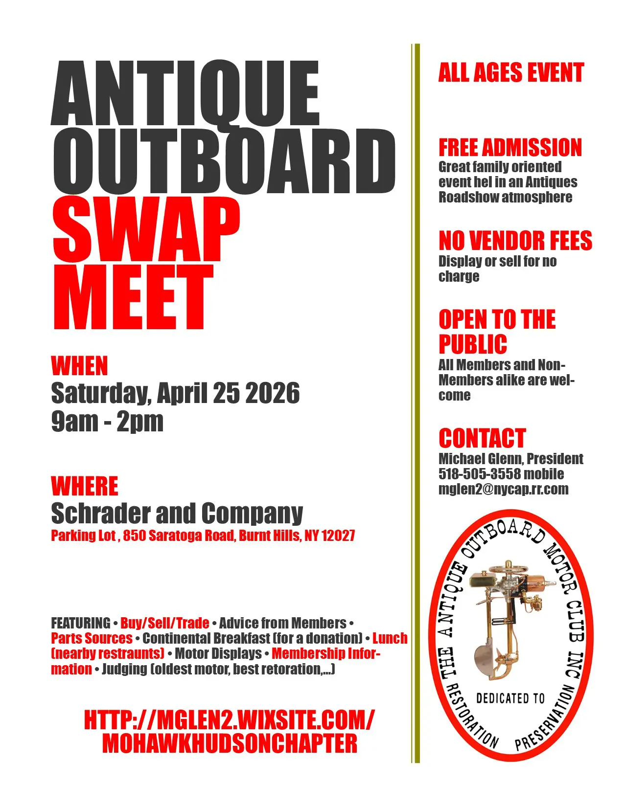 Meet held at church hall. Outdoor swap meet in parking lot. Looking for indoor displays of antique and vintage outboard collectibles such as spark plugs, oil cans, motor accessories, outboard […]