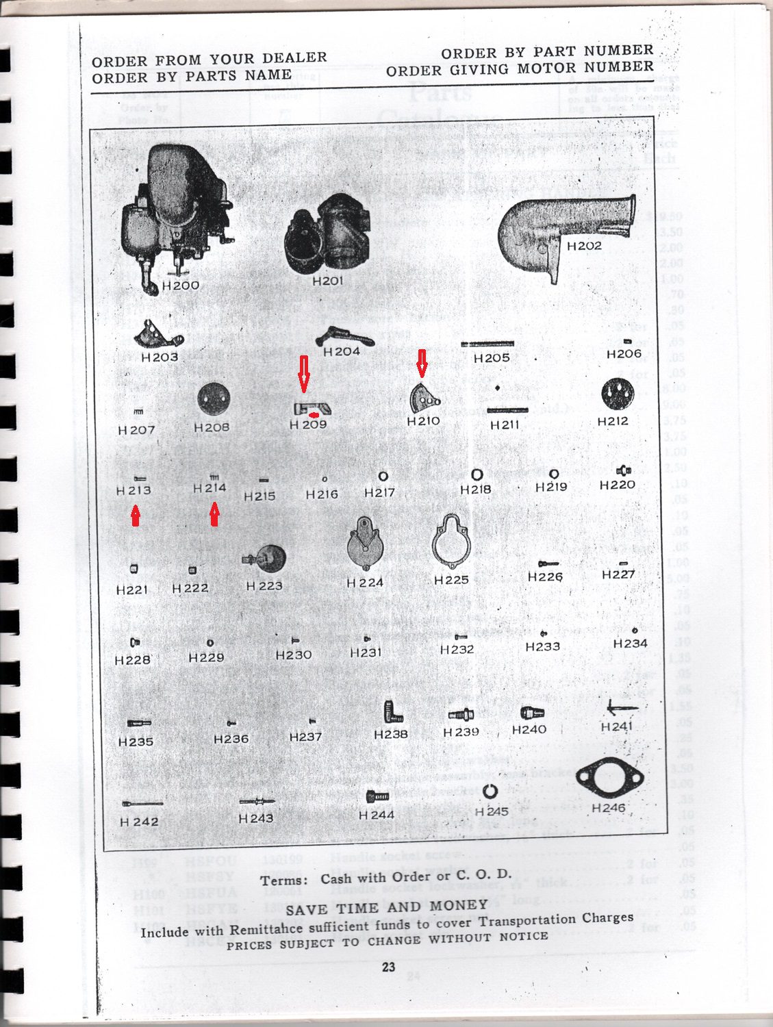 My motors are in a warehouse and as soon as I can, I’ll take a picture of the air horn and its choke lever. But, here is the page from the parts manual…The choke quadrant is shown and has a, for lack of a better word, cover that has a detent in each end. The choke lever has a spring-loaded pin that pops into the detent to hold the choke lever in either the on or off position. Both are usually broken. Art DeKalb used to make the castings for those.