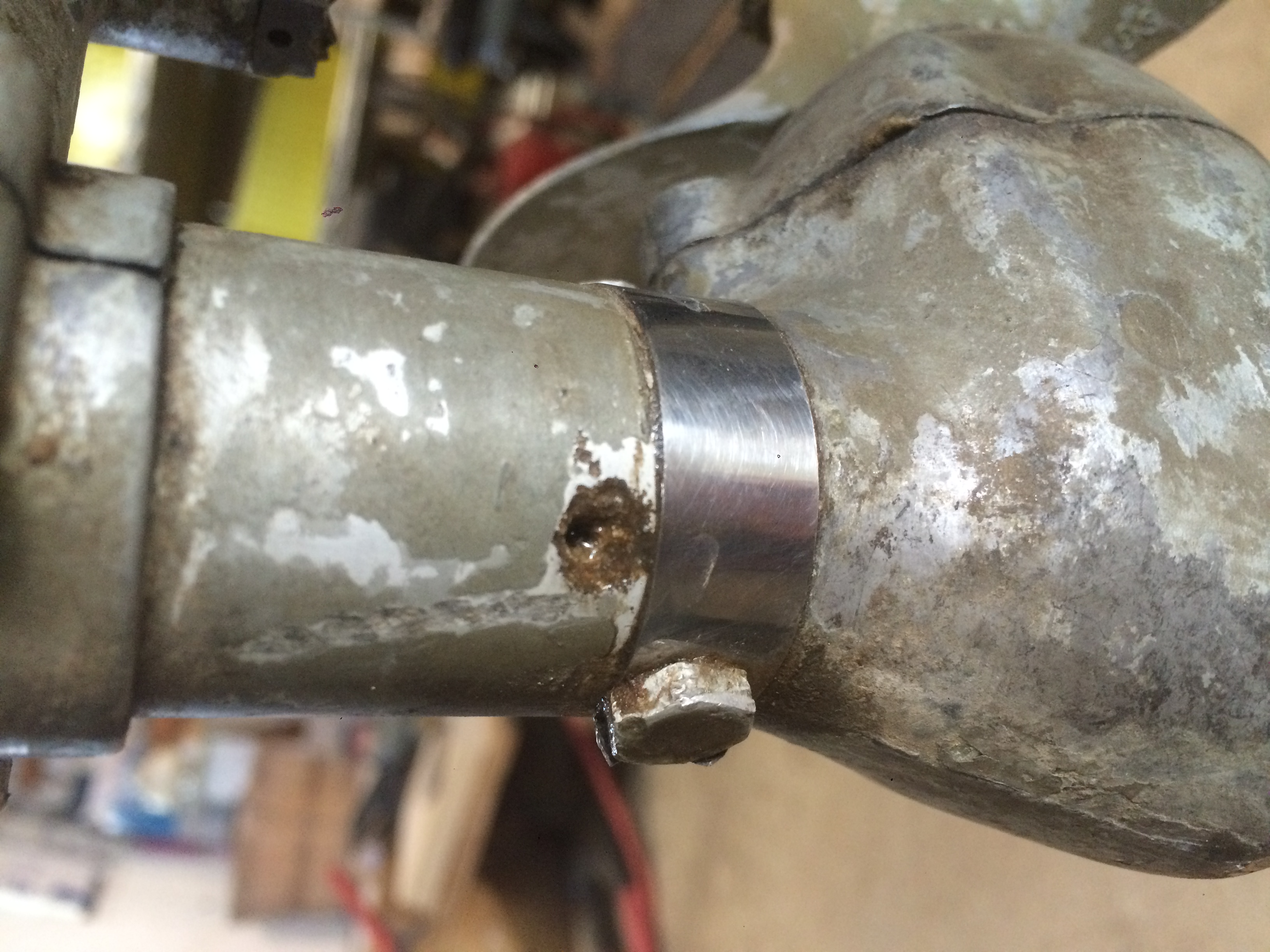 The hole in the exhaust tube usually lines up with the water outlet (an expert will jump in and say something different 🙂 ) but I remember reading that it’s part of the pressure relief for starting. I’ll post the details if I can find them again. On later models it was riveted in place.