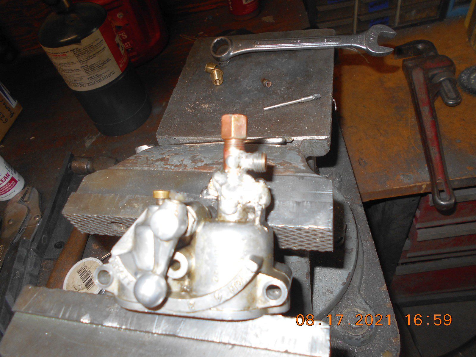 so I can try to fire it up before the replacement carb arrives.I put a few 1/8″ NPT threads into the old fuel passage, just below the float needle.