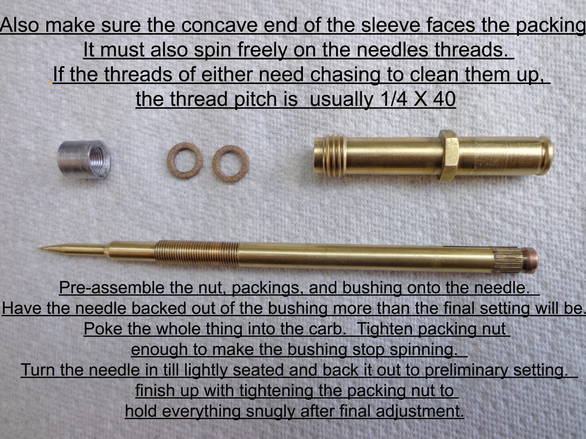 Now push the whole thing into the carb and tighten the packing nut just enough to prevent the bushing from spinning. Now you can proceed to lightly seat the needle and back it out for the preset.
