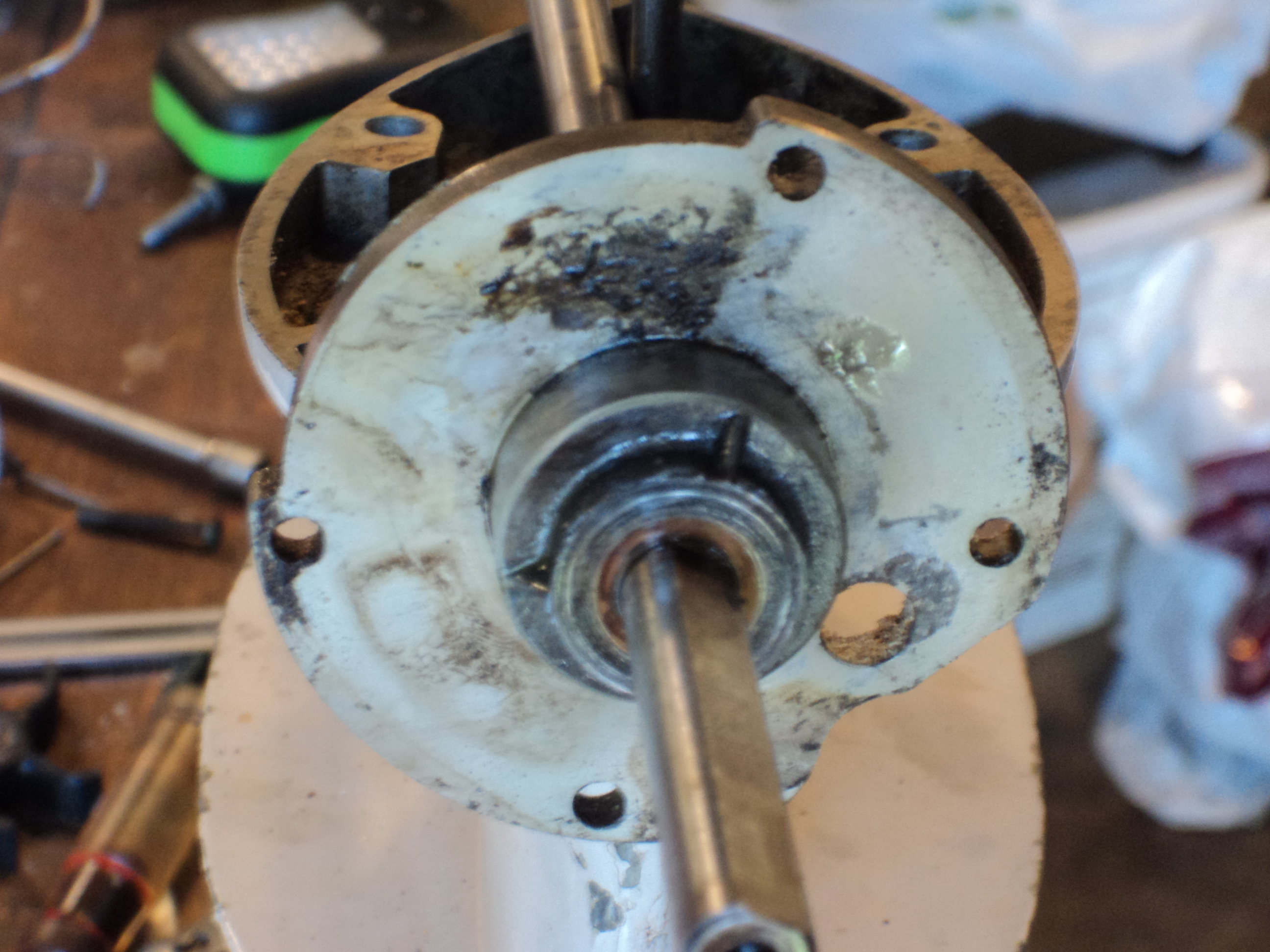 August 15, 2016 at 8:40 pm #42135See pics. This does not match any of the parts breakdowns. One piece drive shaft, solid hub prop with bronze shear pin. There is no color mismatch that would suggest a Frankenmotor. I don’t know if the pinion teeth are worn; there is thrust wear between the pinion and the housing, which may or may not be normal.