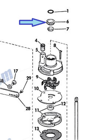 December 8, 2016 at 10:33 pm #48884This is the part you mean, #6 or P/N 309607 on ME’s diagram. No. it doesn’t ride on the shaft, it fits on top of the pump housing and I’m sure the outer O ring shaped part of it makes the seal with the exhaust housing. I don’t have a 9.5 exhaust housing handy to verify that but some other models use just a large O ring. The inner floppy part is like a dam to help keep water inside the finned area of the pump housing. The fins in pump housings help to keep water from sloshing out of the pumps well because the impeller will suck air into the system if it gets dry in there. Right below the water tubes rubber grommet is a small hole which feeds water to this area. When replacing the grommet, make sure this drilled hole is clear to help prevent the motor from running hot.