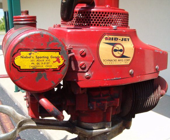 That appears to be a 1960s outboard with a Tecumseh 2-stroke powerhead. I have not seen one with a separate driveshaft and exhaust before, nor that specific swivel system design. I find these motors interesting. Yes, it’s worth repairing – it has quite a simple powerhead, I think, but the carburetor with its diaphram instead of float bowl makes things a little different. You can still find a carburetor kit. I think it’s Tecumseh # 631893A. As this motor has an air-cooled powerhead, you might be tempted to think it is ok to run it out of the water. However, there is no gearbox to fill with oil. Instead, I believe the lower driveshaft bearing in the jet area is water lubricated, so don’t run the motor out of the water. The powerhead likely needs at least a 16 to 1 gas oil mix. Maybe 12 to 1 or 8 to 1. I know I have been surprised before when I was informed that a Tecumseh 2-stroke called for more oil than 16 to 1 mix. 16 to 1 will likely be fine in this motor with synthetic oil. Please make sure you use air cooled two stroke oil. TC -W3 rated oil, likely saying outboard oil on the bottle is unsuitable as it’s meant for cooler running engines. Have fun with your new project! P.S. Check for a patent number you can look up on top of the jet drive