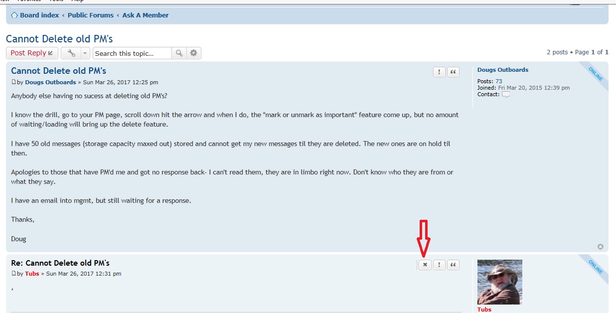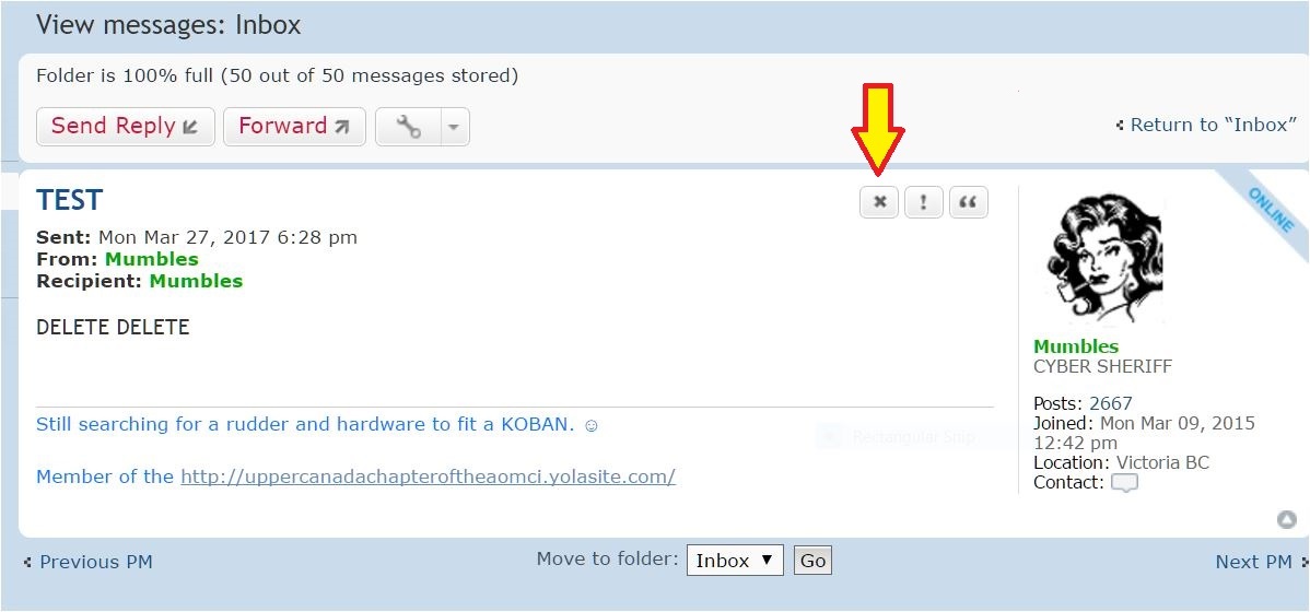 March 28, 2017 at 1:38 am #55064March 28, 2017 at 2:58 am #55073Mumbles please see my response to tubs same suggestion above. I have no x only the quote and exclamation point when I go in to delete an email. No x at all. Have tried to delete individual PM’s, but no x is displayed. I am downtown on my new kindle fire on wifi and still the x feature does not come up. OK risking a lynching here but I must reveal a dark secret… I have been on aomci almost daily since 2001, but sadly I am not a member yet. (Hanging head in shame)… Maybe deleting is not an available feature to me as a non member?. I should join anyway, never seen the inner sanctum and such. Think I will.