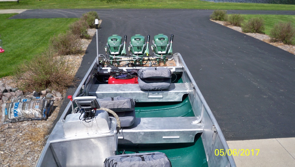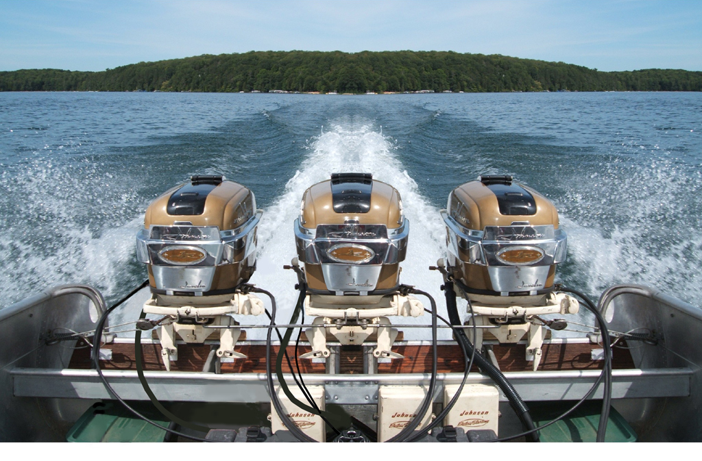 Here is a picture of the maiden not so successful voyage. They all ran in a barrel before I started out on this "burn-in under load" trip to open water. Could not get them all to run at one time, and although a wide and slow moving body of water, the lower Fox River, was not a good place to fight a trio of hard starting, poor running fresh (amateur) rebuilts!