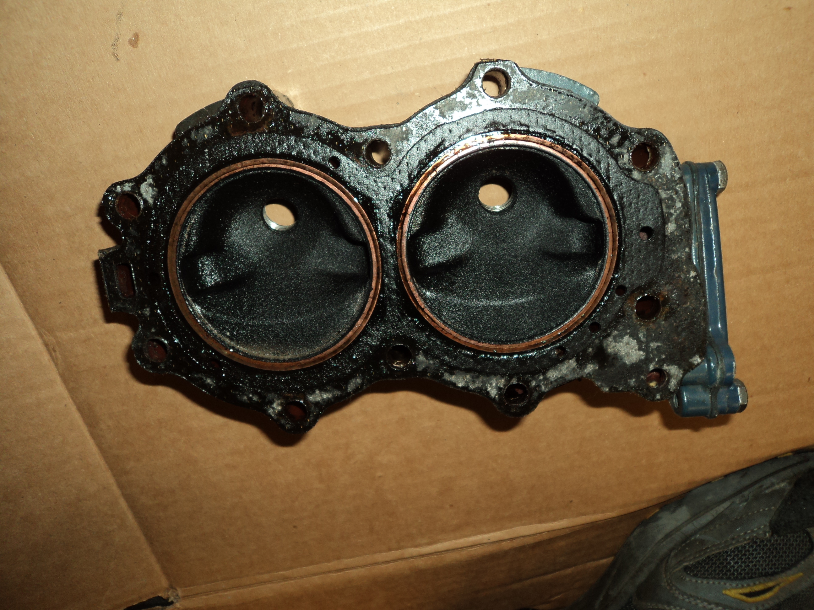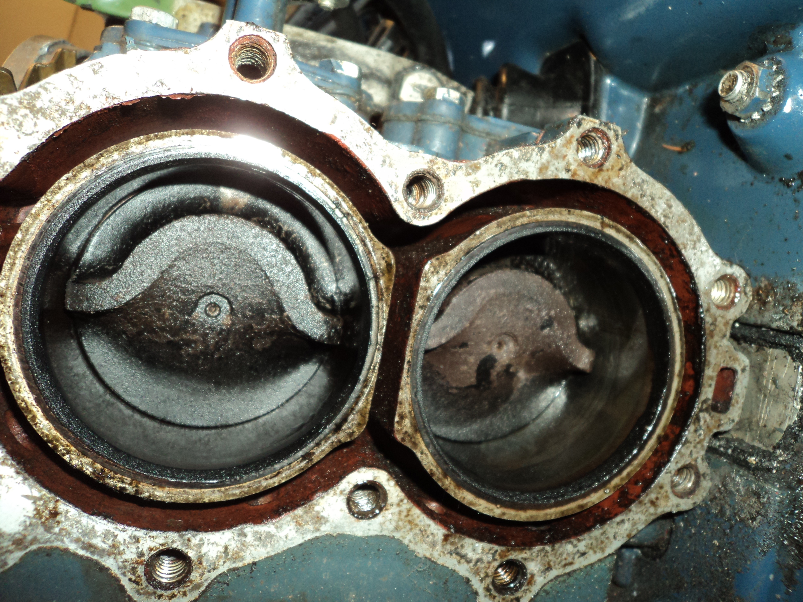 September 15, 2016 at 3:59 pm #44076Comparing with the pics on your site, I’d say this is the 25 hp head. Agreed? There is a little scoring of the bore. (Sorry pic out of focus). Think I can run it without a teardown?