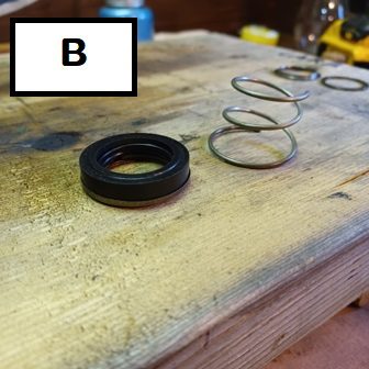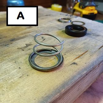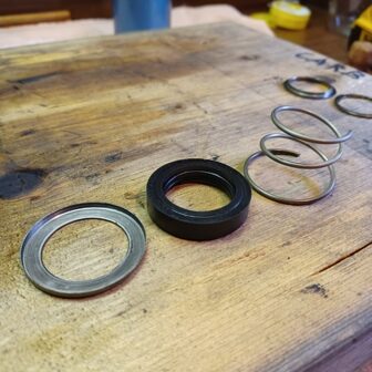 Carbon seal goes in first, large washer on top of the carbon seal, then spring, then small washer, then retaining clip.