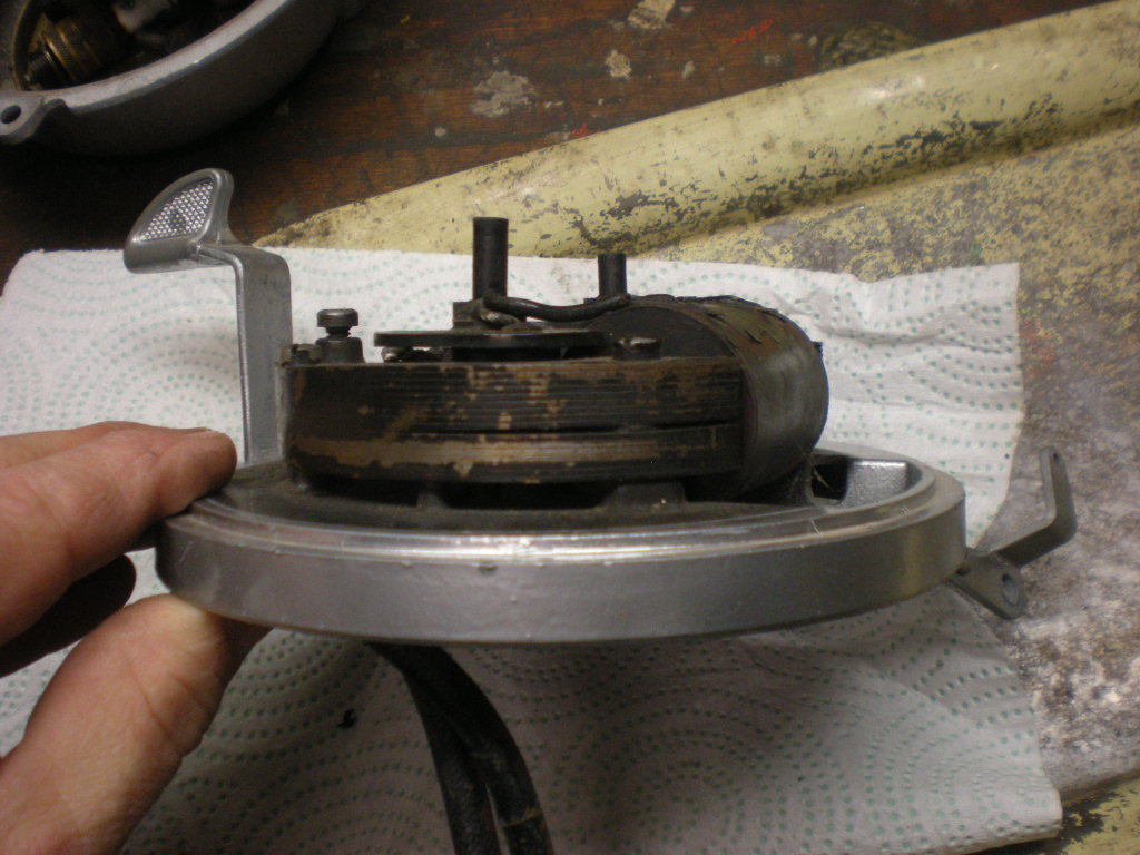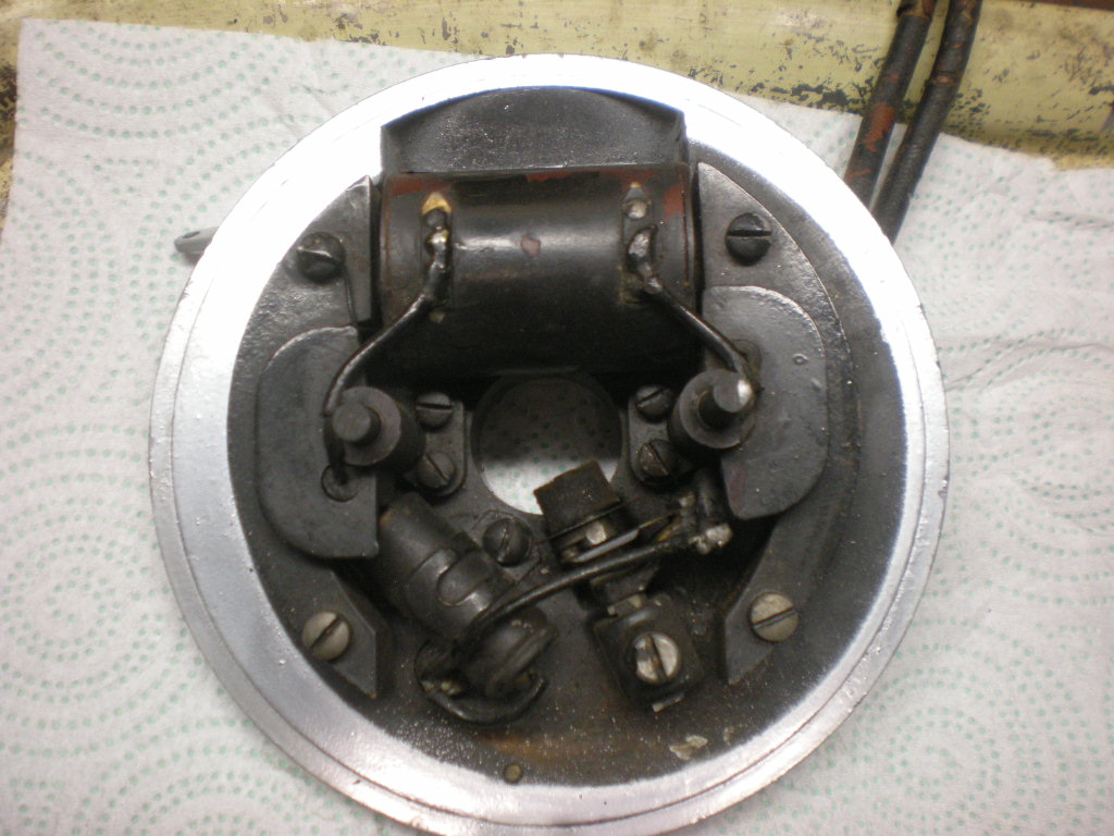 April 5, 2017 at 8:29 pm #55635The gap in the lams is normal and is caused by the coils mounting ears. If you take it apart, record the number of lams above and below the coil ears so it goes back together the same way. The brushes ride in brass tubes which can be cleaned with a barrel brush. I think i spun a .22 or .223 caliber one in a drill to do mine. Check your brush holders to. One of mine was burned thru at the bottom and leaking current to ground thru a mounting screw. Also make sure there is continuity between the little brass grounding plate under the flywheel and the flywheel itself as there is a little tiny spring under the plate which might burn out. The wires on my HS-10 had been soldered onto the points to so I took a brass plate with the screws in it off a spare set of HD-TN points so I wouldn’t have to solder them back on. The original condenser was rated at 0.18 uF so I epoxied two Vishay 0.10 caps into the original can to help make it spark again.