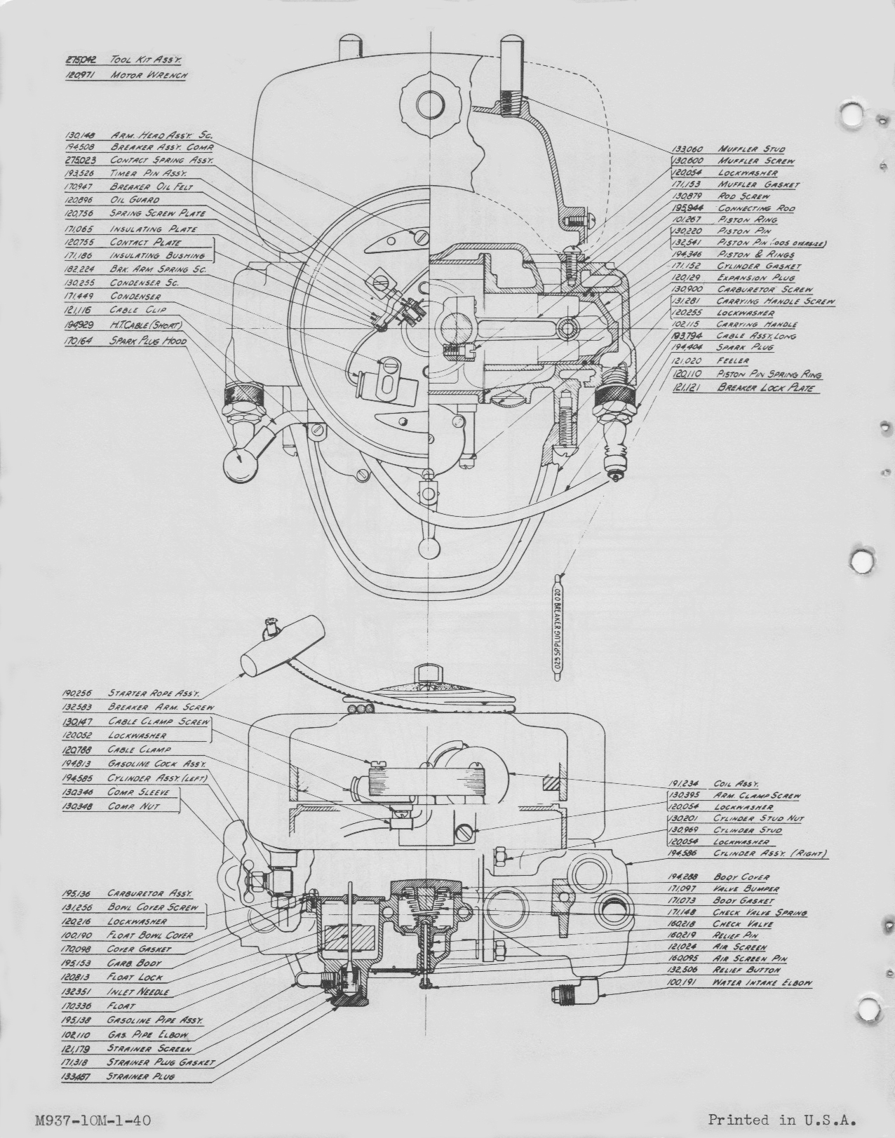 I got the tiller to turn after taking apart the tiller and putting the ball bearings back in the right place. The diagram helps a lot , I guess it is all there minus the tiller assy. The one I have is broken off between the handle screw and the power head , they screwed on a replacement tiller handle to the broken piece. I think this a neat motor in good shape I have 2 other elto pals I like very much Thanks againJuly 10, 2016 at 1:14 am #39957Elto built 4000 Handitwins in 1940. Models with serial numbers of 4001 and higher were built in 1941. 1942 production was stopped by the start of World War Two. It is a two cylinder apposed motor with a bore of 1-¾" and a stroke of 1-⅜" for a piston displacement or 6.07 cubic inches. It’s 3 horse power is rated at 3,500 RPM. The fuel tank holds 3-½ pints and will run the engine upwards to an hour depending on load. It is water cooled by an aluminum veined two stage centripetal pump at the top of the gearcase. It weighs 31 & ½ pounds and sold for $68.50 FOB Milwaukee Wisconsin in 1940.