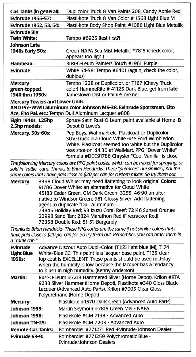 I remember a list of automotive paint colors that are very close or equal to many common correct outboard colors – may have been several years ago in our magazine. Can someone post a copy of that list?…or at least the Johnson and Evinrude colors?
