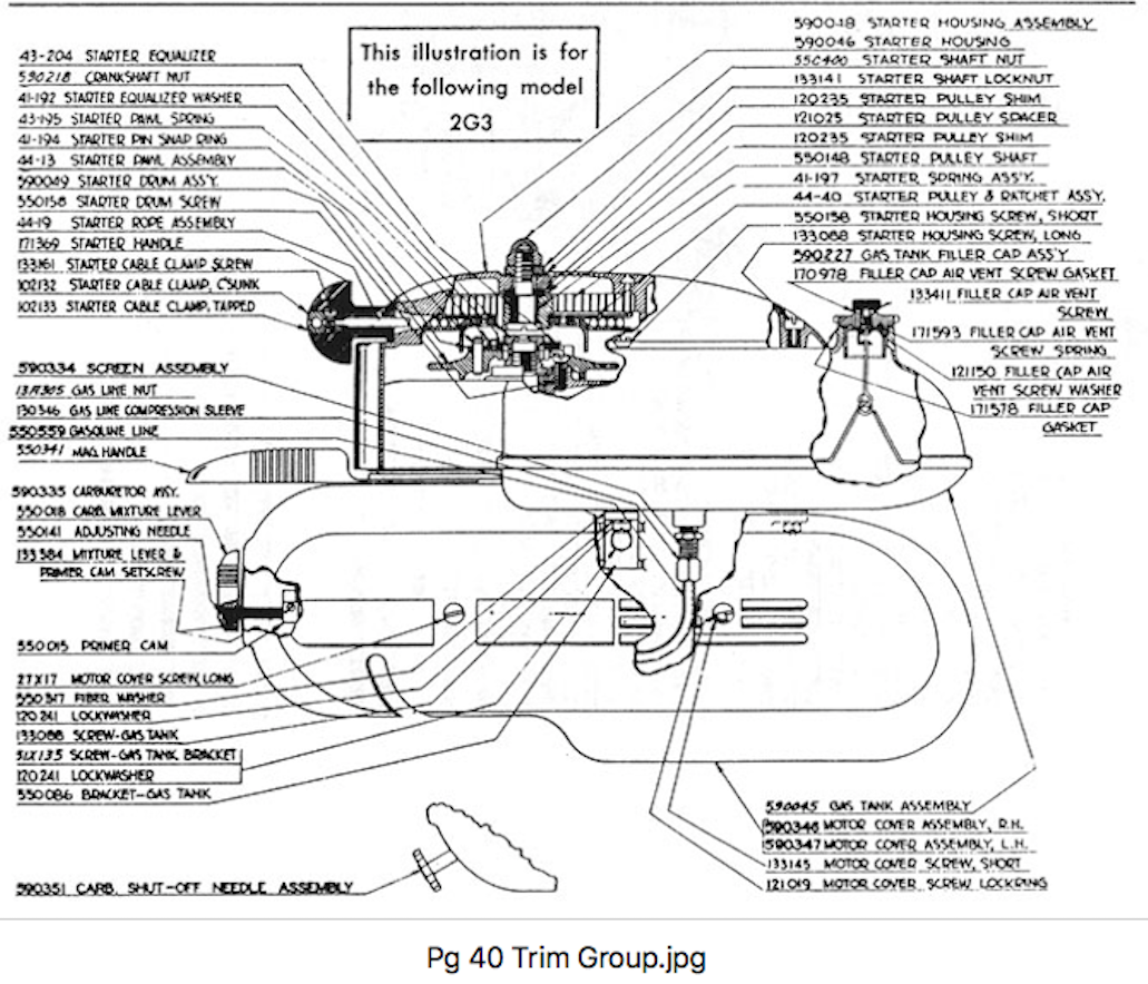 March 28, 2017 at 6:29 pm #55116Nothing wrong with Ben’s post except he got the wrong year. You have a 1948. It is a 5hp motor, Gale model 2G7. The big knob is a combo high speed mixture adjustment and primer. The fuel shut-off valve (fuel from the tank) is right below the big knob. The idle mixture adjustment is a small screwdriver slot screw on the side of the carburetor and works by holding the throttle valve partly open at idle speeds.