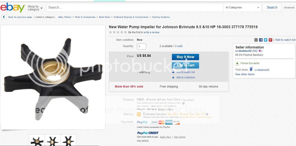 December 15, 2016 at 4:54 pm #49234Oh these are definitly "Cheap" impellers! The question is do they have any quality to them? Are the hubs bonded properly? Are the dimensions correct? Time will tell if anyone is bold enough to buy them. With the problems experienced with Sierra impellers I dont think Im will be buying "Cheap" impellers. Like buying Sierra ignition components? Just my two cents.
