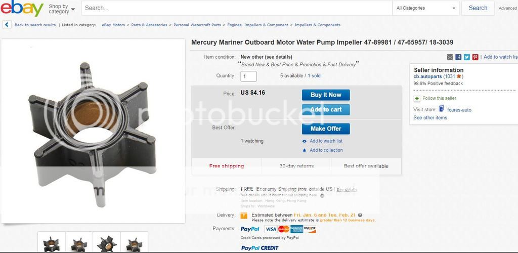 My main point is: Think about what you are buying. An impeller for $5 – $6 dollars with "Free Shipping" from across the world. Did your mother ever tell you "If something seems too good to be true, it probably is".Dan in TN