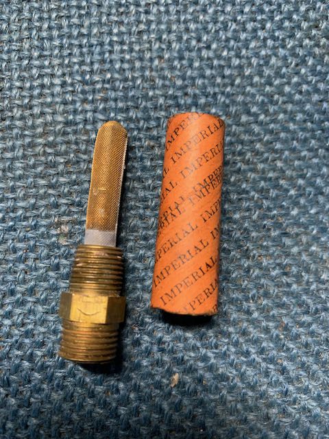 I have made a few of these with pretty good results. Granted, they don’t look as good as the Martin Guy’s! I made a couple wraps around the bolt, then tacked it in a couple places up the seam. Then place it in your fitting and solder the screen to the brass fitting. Heat the fitting until the solder melts. When yo get that done, just pinch and fold the top and add a drop of solder to hold it. I don’t think it’s too critical to solder every bit of the seam as long as you have good overlap of the screen.