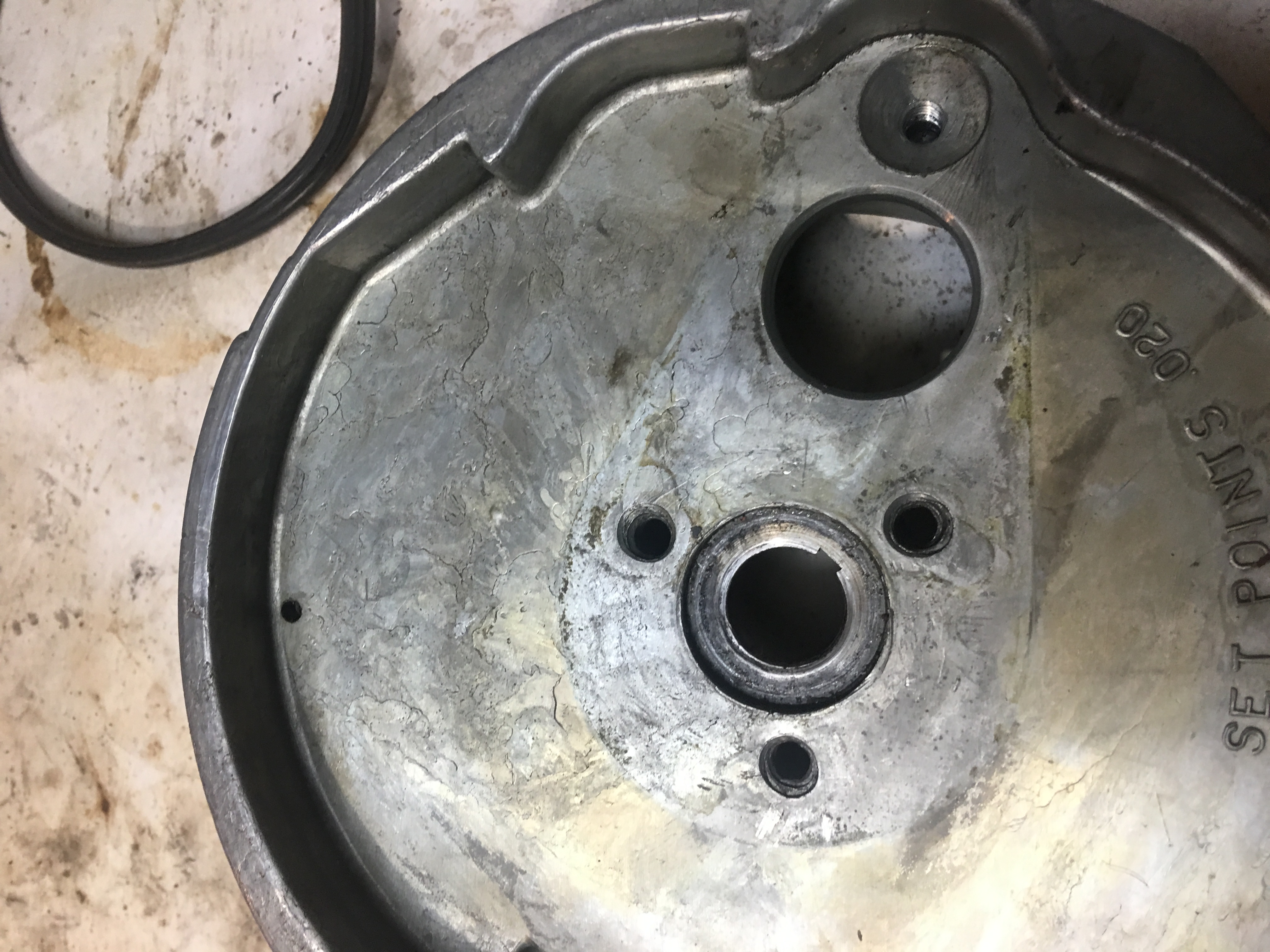 Someone raised a good point about the missing fasteners, perhaps the mag plate is just being drawn upward because it is loose. I realize the screws are missing because you pulled it apart for pictures. Nonetheless, reinstall the fasteners, then try lifting up/down on the mag plate to see if it is loose for some reason. And, it is surely possible that someone pried up under the mag plate while trying to remove the flywheel in the past, which may have bent it.