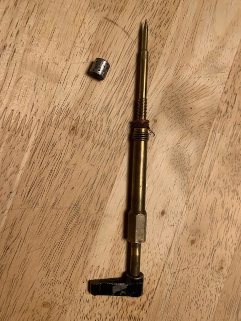 Install the needle valve into the carb body with it partially threaded into the threaded insert (not too far, you don’t want to jam the tip of the needle into the mixing pocket). Install the packing and packing nut, tightening it down enough to hold the threaded insert in place while threading the needle valve into the carb…