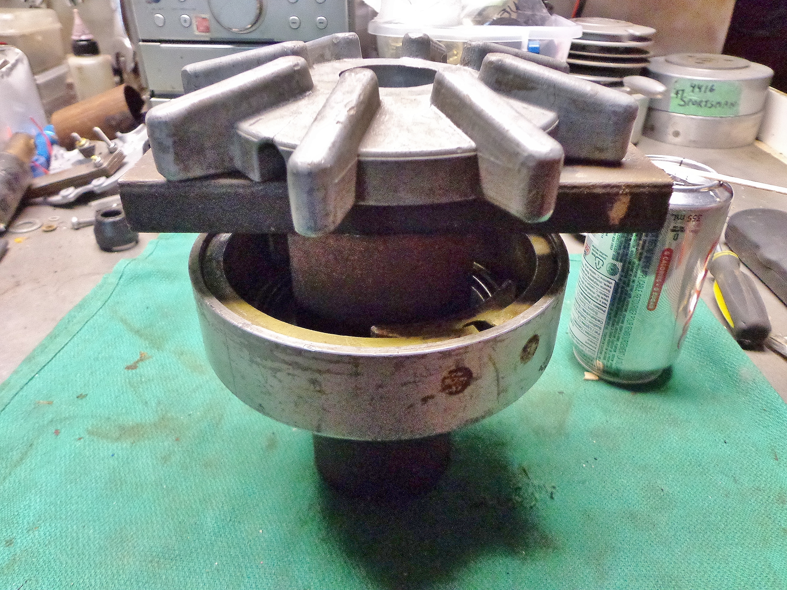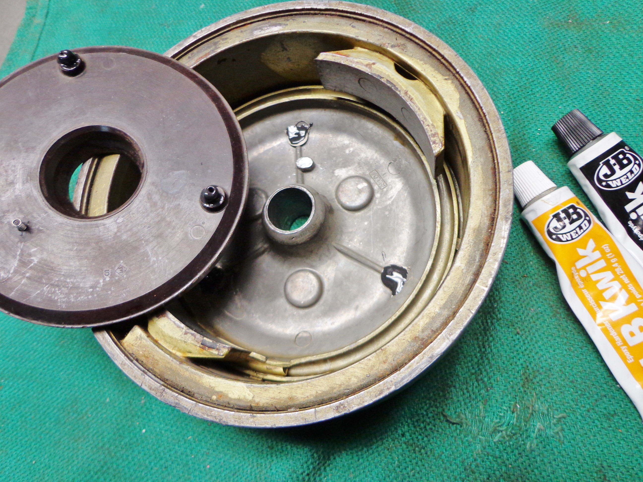 bakelite plate.I drilled just enough of the rivet so the plate would come off the flywheel. A few well placed dollops of epoxy were applied to both surfaces before reassembling it with the new spring in place. Getting everything lined up was tricky so I used a thin piece of wire stuck into one of the rivets to help as a guide. When everything was in place and checked out OK with the ohm meter, I stacked some weights on it while the epoxy cured.