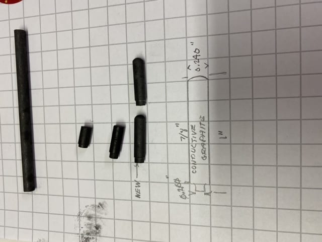 I will let you know how the parts turn out and, more importantly, if the engine runs smoothly after I get them replaced. If anyone has any information on the original length of these rods let me know. McMaster Carr has 1/4″ conductive graphite in 6″ and 12″ lengths.