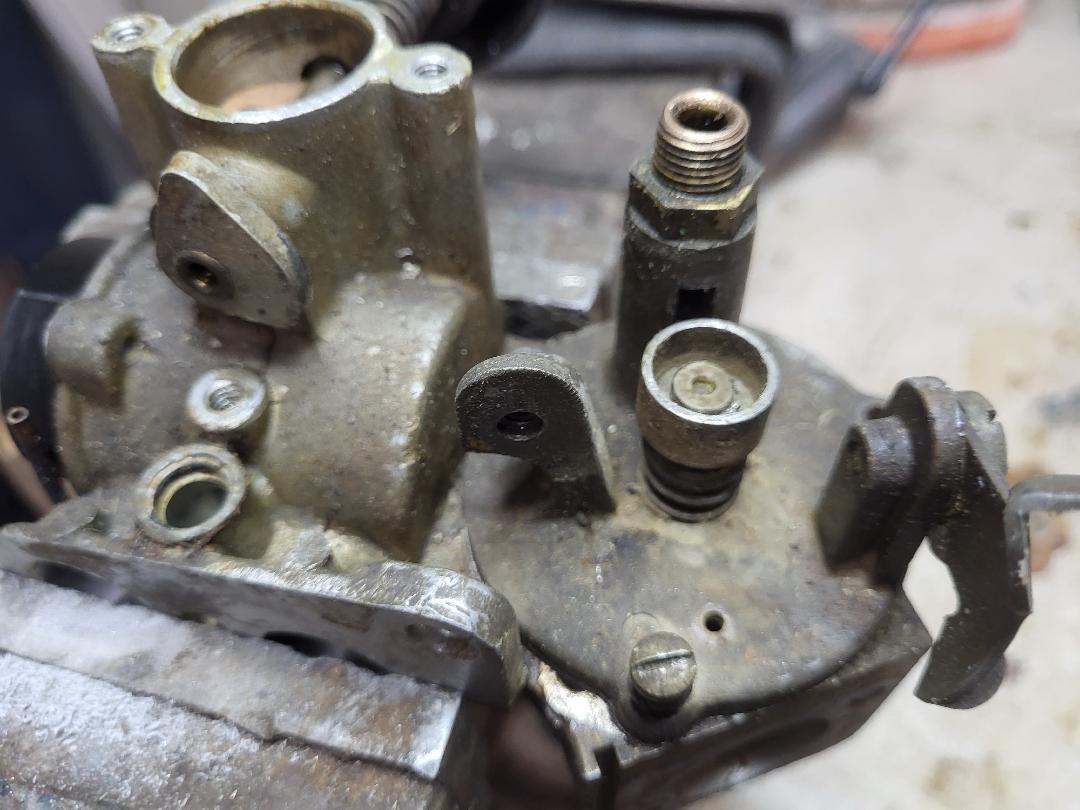 I have a light four that needs the carb cleaned. I am trying to remove the cover over the float bowl but there is a spring and “cap” of some sort preventing me from taking it off. I have attached a pic. How do I get this cover off to get access to the float bowl.
