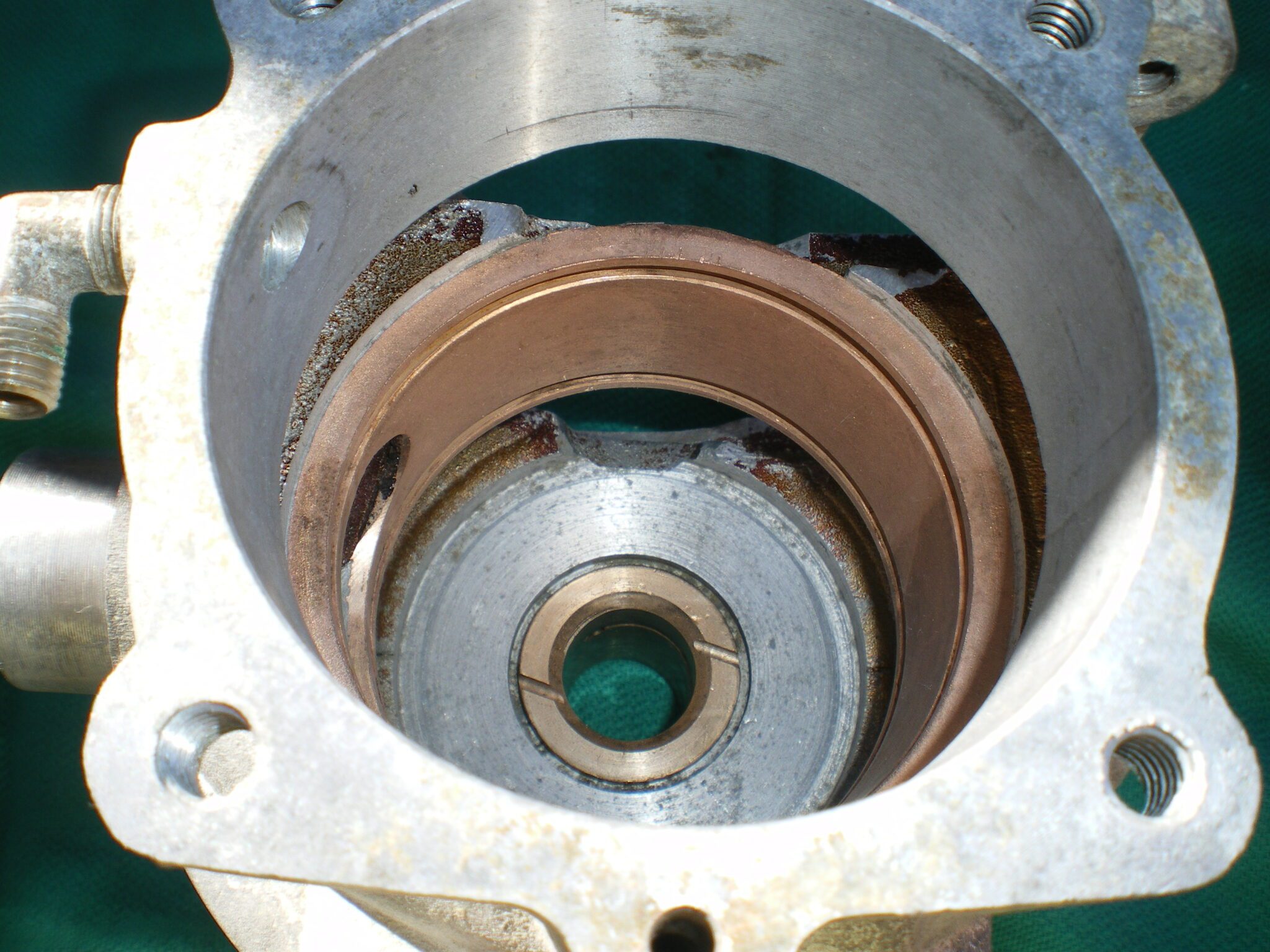 In this photo you can see the grooves in the large bronze bearing which the sealing rings fit in and why they require an 8:1 fuel mix.