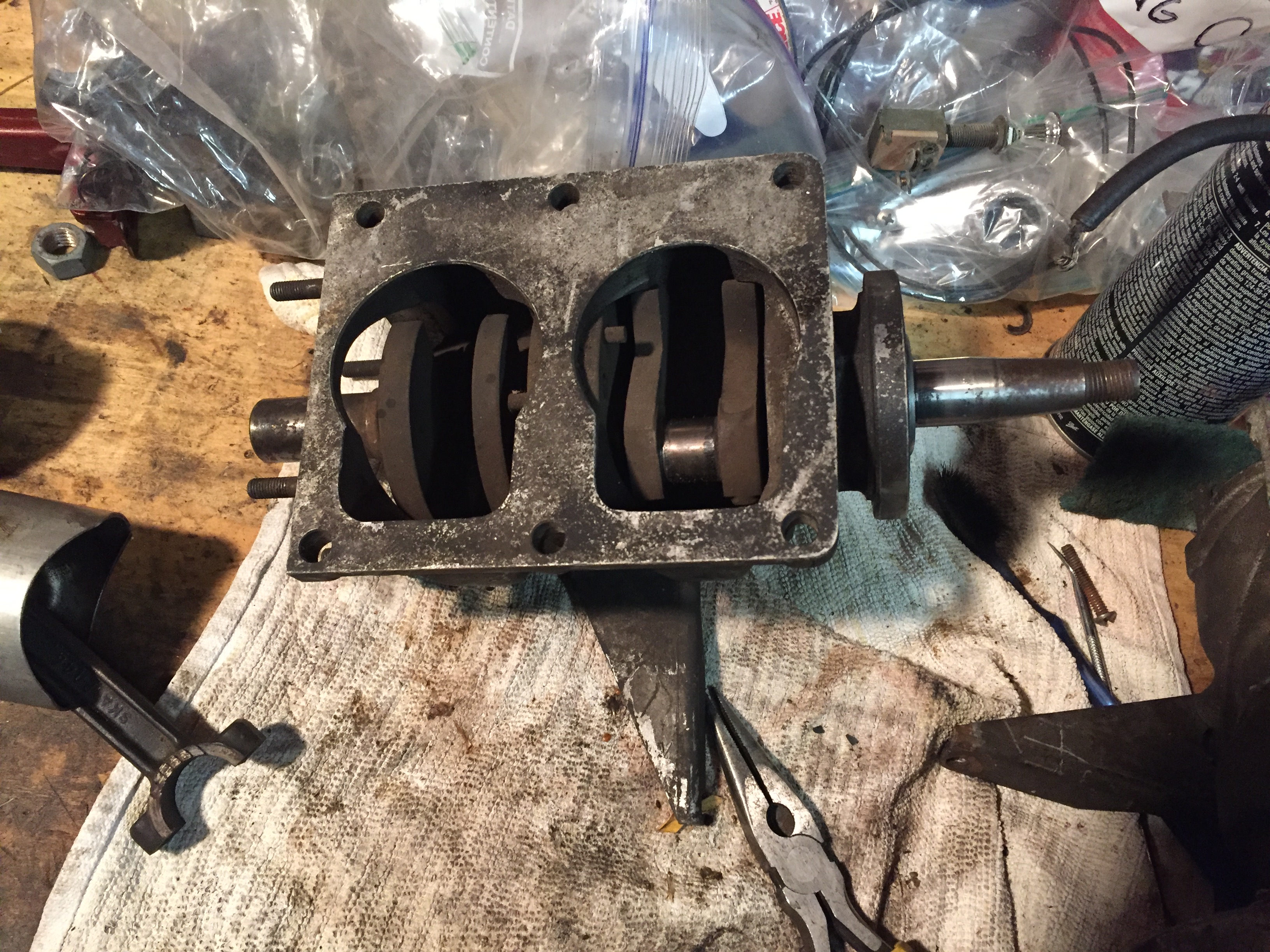 2 disassembled (mostly) Mercury KE-7s came to me in a couple boxes and I’m hoping to get one out of the two. There is zero chance both poewheads can be resurrected. Soooo…. how do I remove the crank and main bearing? It seems obvious it has to go out the bottom but the main (center) bearing doesn’t seem to want to move, even though I removed the bolt that holds it to the block.