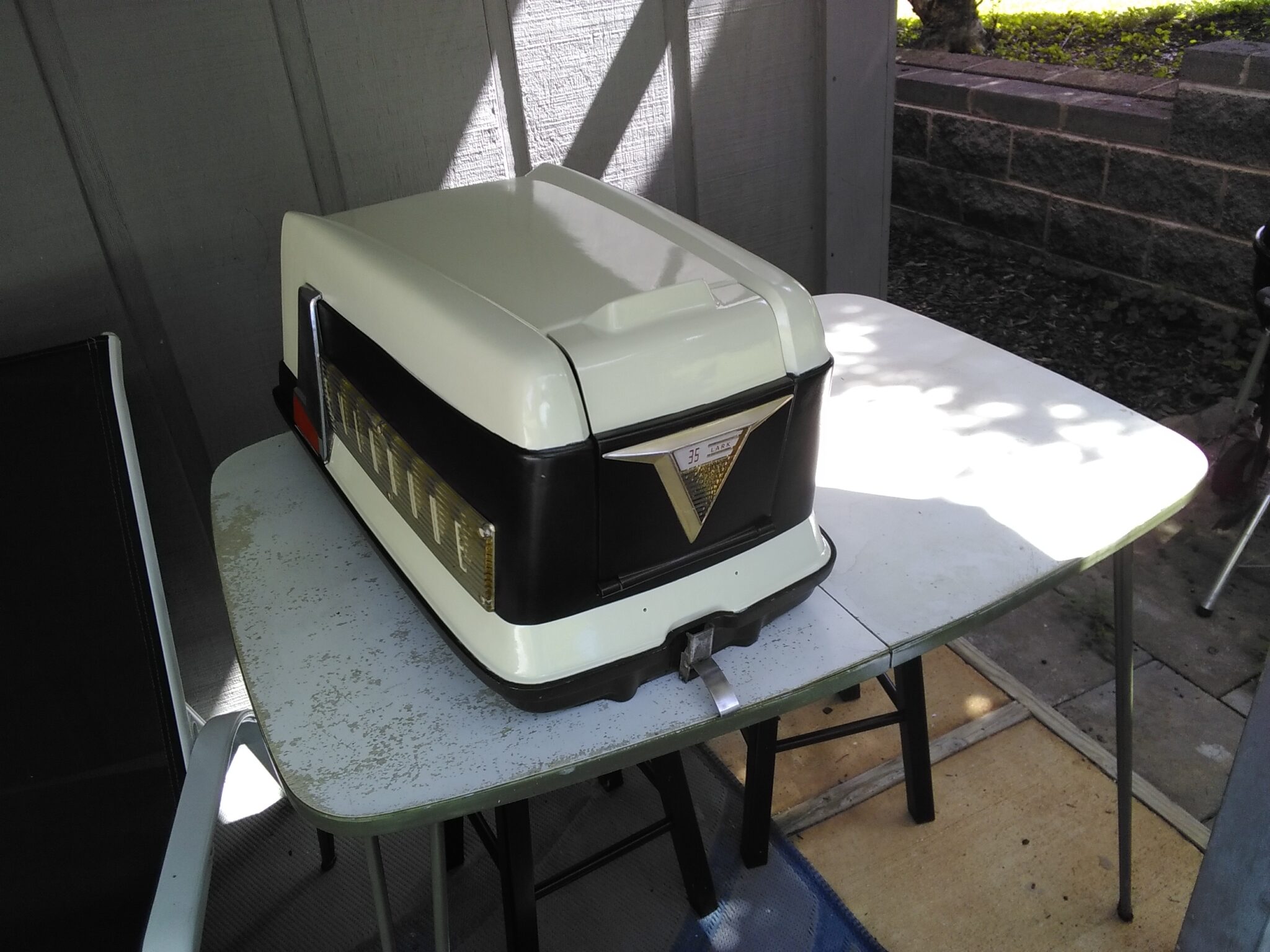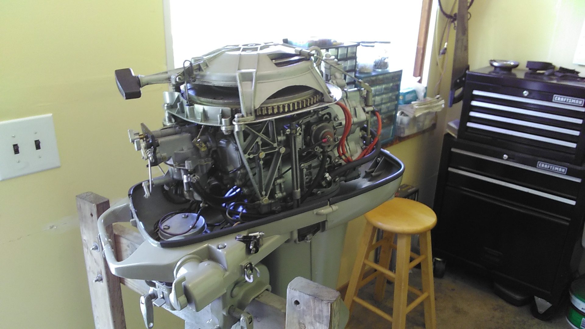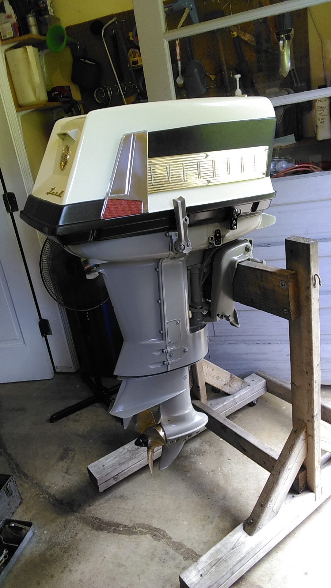 Picked this one up for $120 complete with harness and keyswitch. Has good compression and everything under the flywheel has been replaced already. I cleaned/set the points and cleaned the carb. I did have to reseal the gearcase and new impeller. This is going to be a keeper – hopefully I can find a nice late 50’s Glasspar to put it on. Finished painting the cowl – pics attached. I’m missing one of the “Lark” badges. Hopefully I can find one. A fun project.