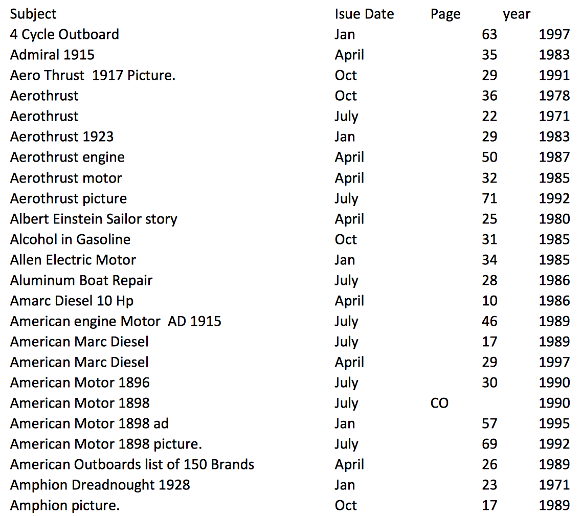 The content varies on whatever our members are discussing. You also get access to our Michigan wheel base, meet photos, Member database, back issues of our Antique Outboarder magazine. Also access to a Dropbox database of outboard parts books & Service manuals. . . 😀