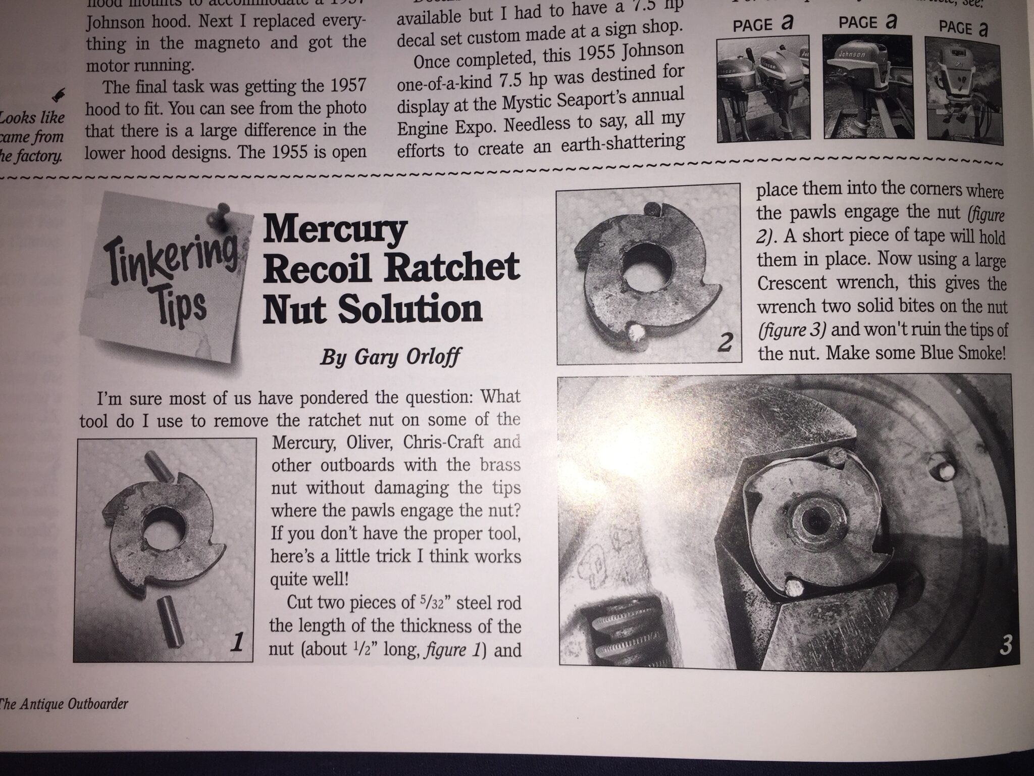 November 6, 2021 at 11:25 pm #249270The October 2020 issue of Antique Outboarder had an article on one way to remove the nut in the absence of having the appropriate tool.