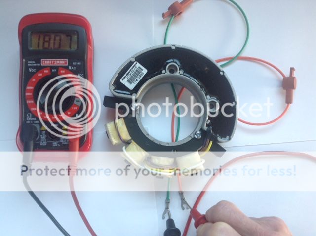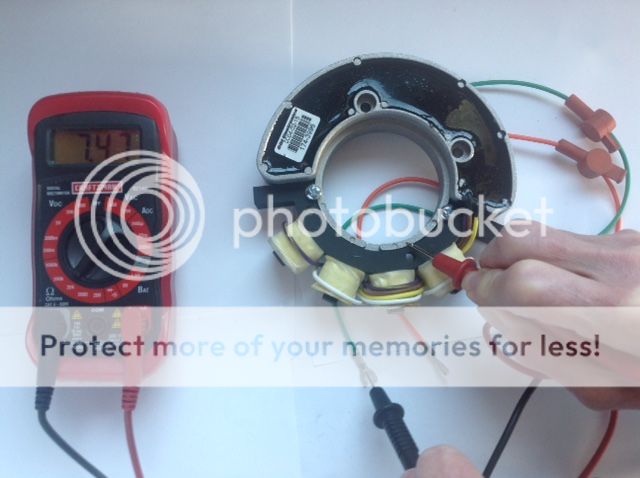 Hi All, got the new parts installed and now have spark. The stator was bad, and so was the coil ! I have posted a few OHM readings from the new stator, and the replacement working coil (first coil picture) below. Please note that the new CDI stator has 2 wires vs. the original Merc’s one green wire. You just run the 2nd orange wire to ground. I am not an electrical wiz, so please just look at the ratings from the new stator, (old one didn’t register anything) and the good coil (actually a used coil from a 1970 7.5HP, that used the same part number) and use for reference when you try to diagnose a no spark problem with a 1970 – 71 Mercs with the phase maker ignition.