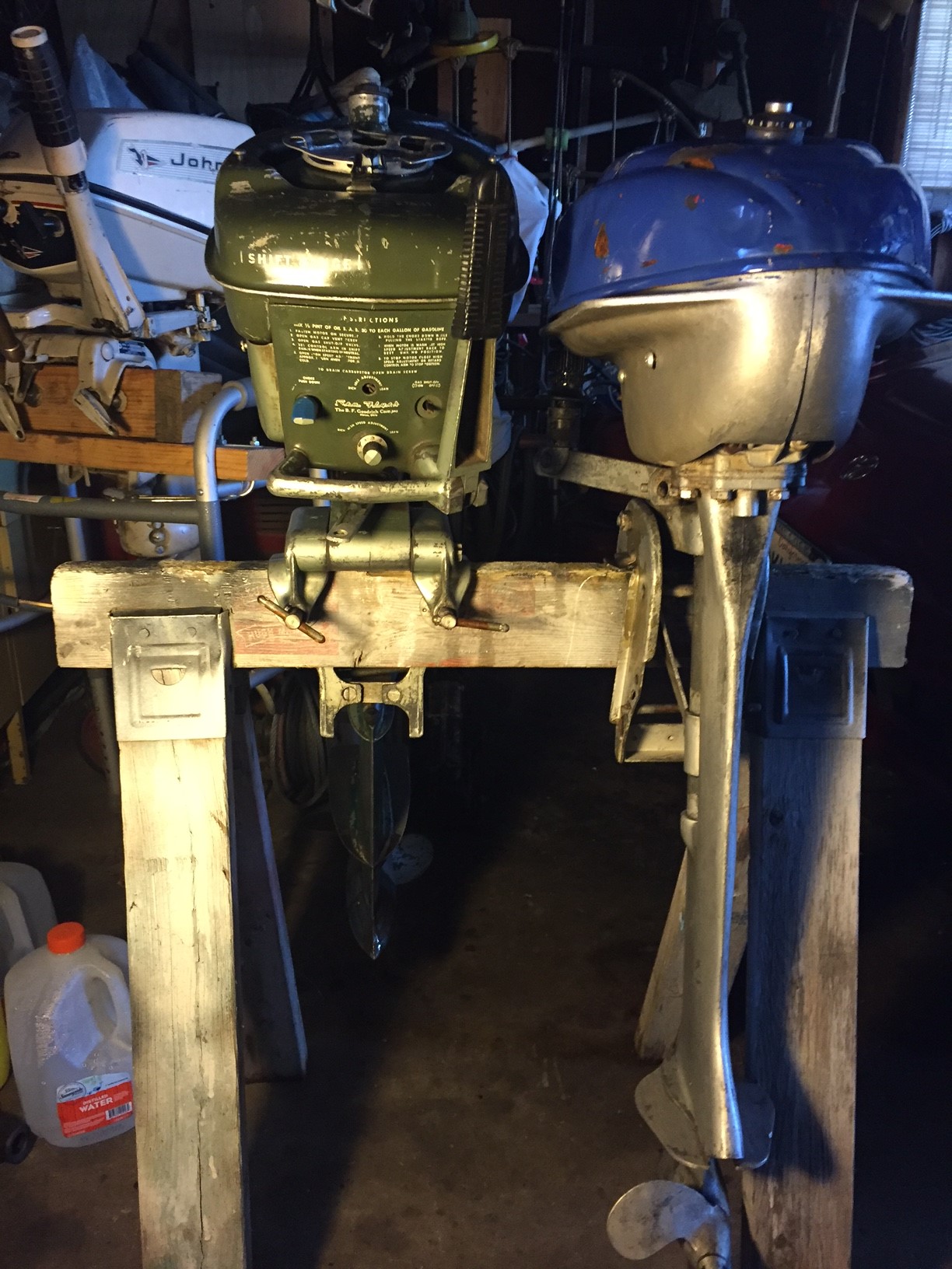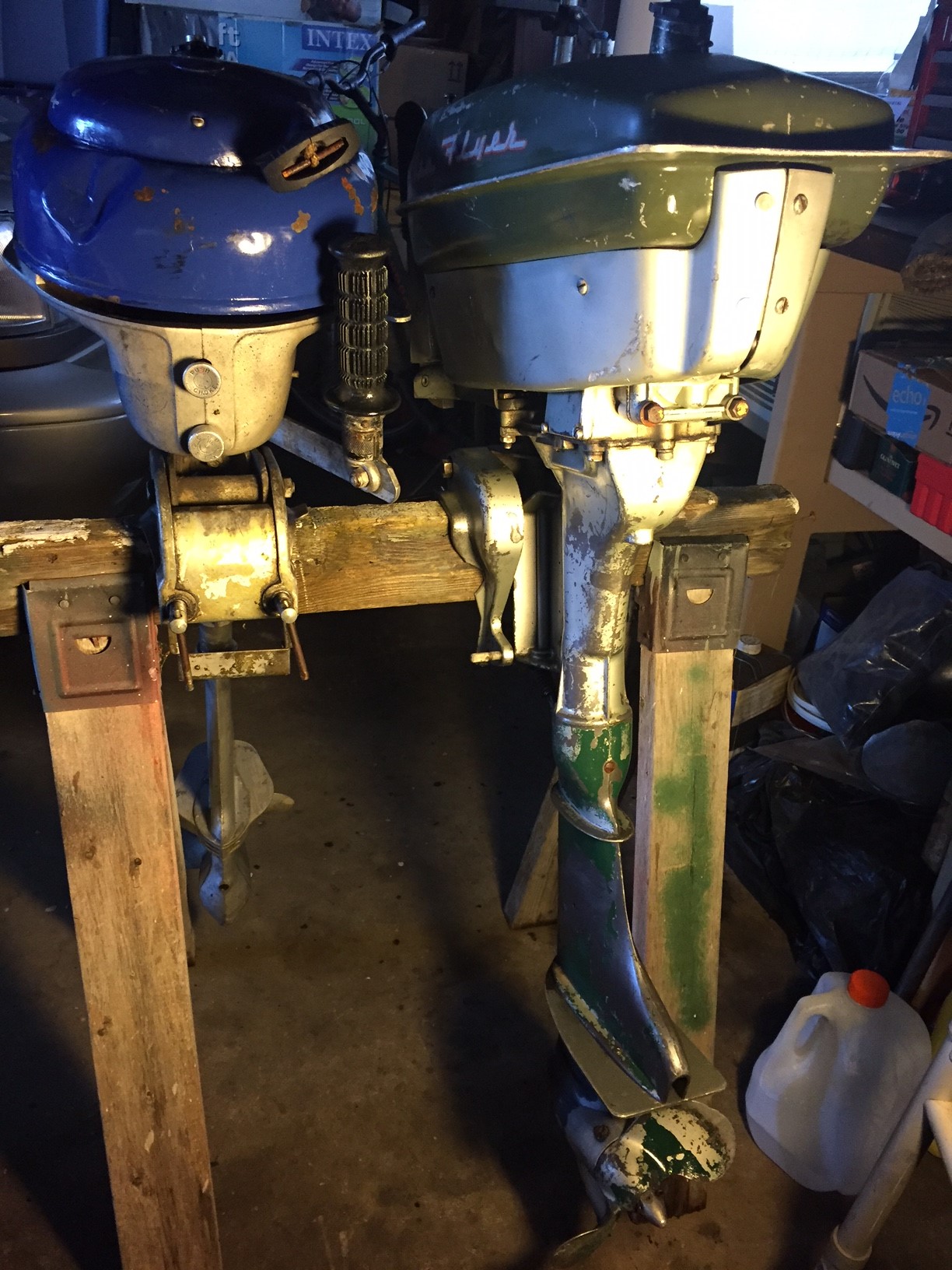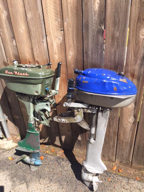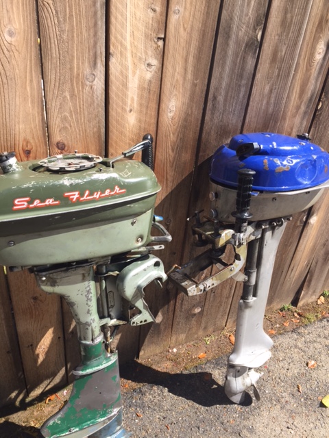 I posted pics earlier, and seem to remember being informed that the "Sea Flyer" is a Champion, and the one with the rattle can blue is a Scott-Atwater.Time will tell if they’re runners or wall hangers, but I’m fine w/ that. The blue one has no serial number plate that I can see on the transom mount; haven’t taken the cowlings off yet, which should be interesting.