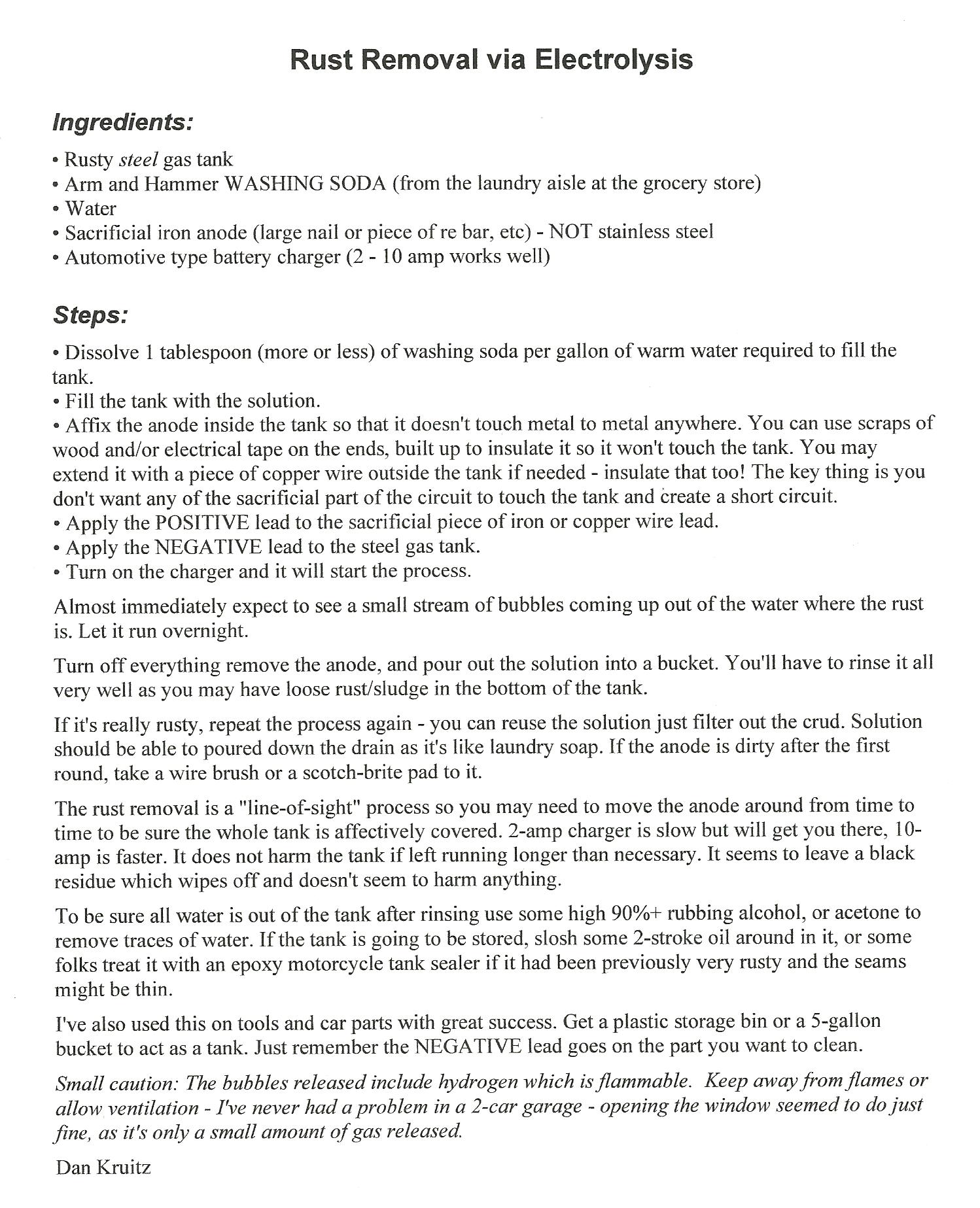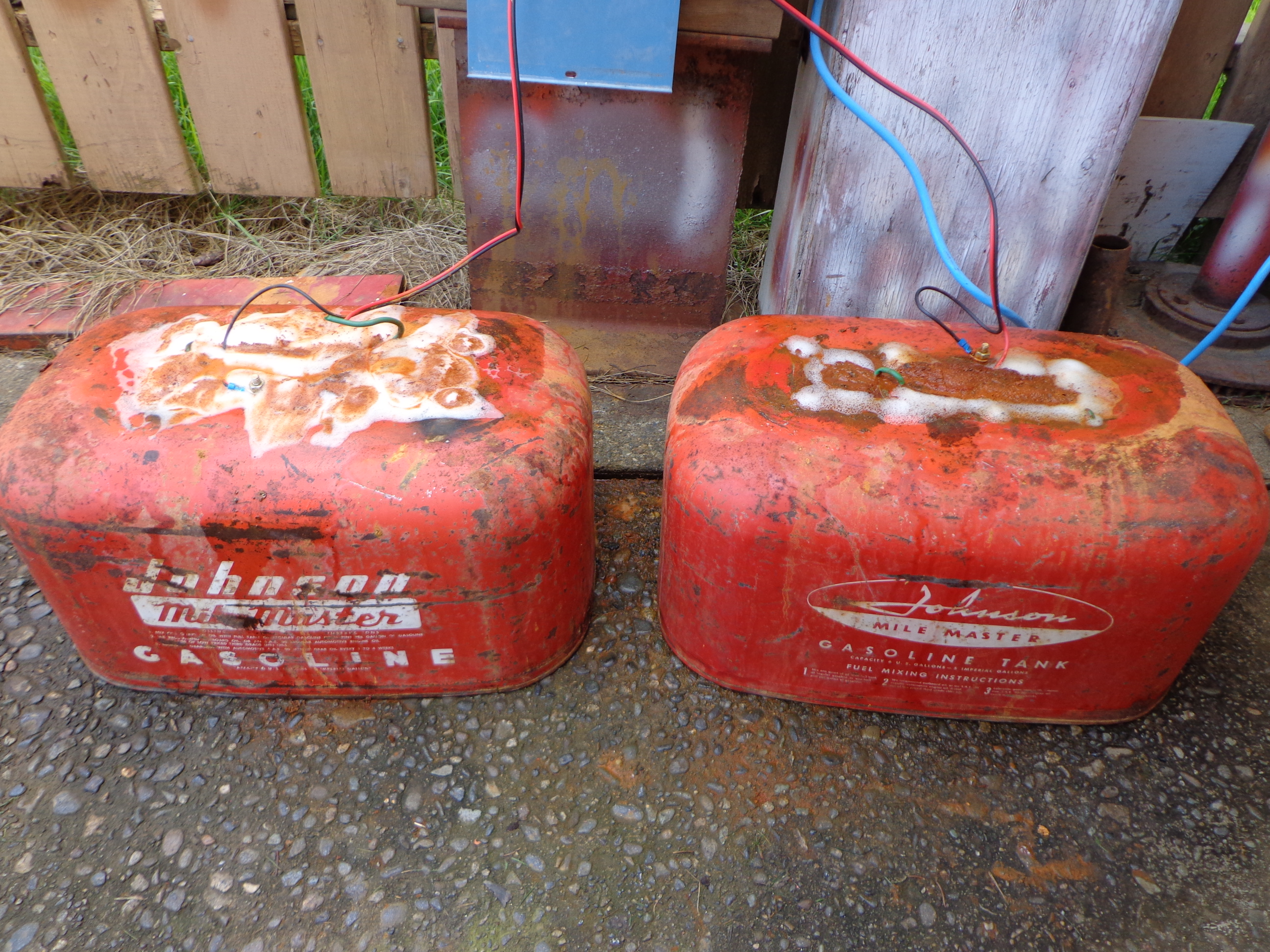 Here’s some info by Dan Kruitz on using electrolysis to remove rust. It works well and with the three bank charger, I can do three tanks at once!