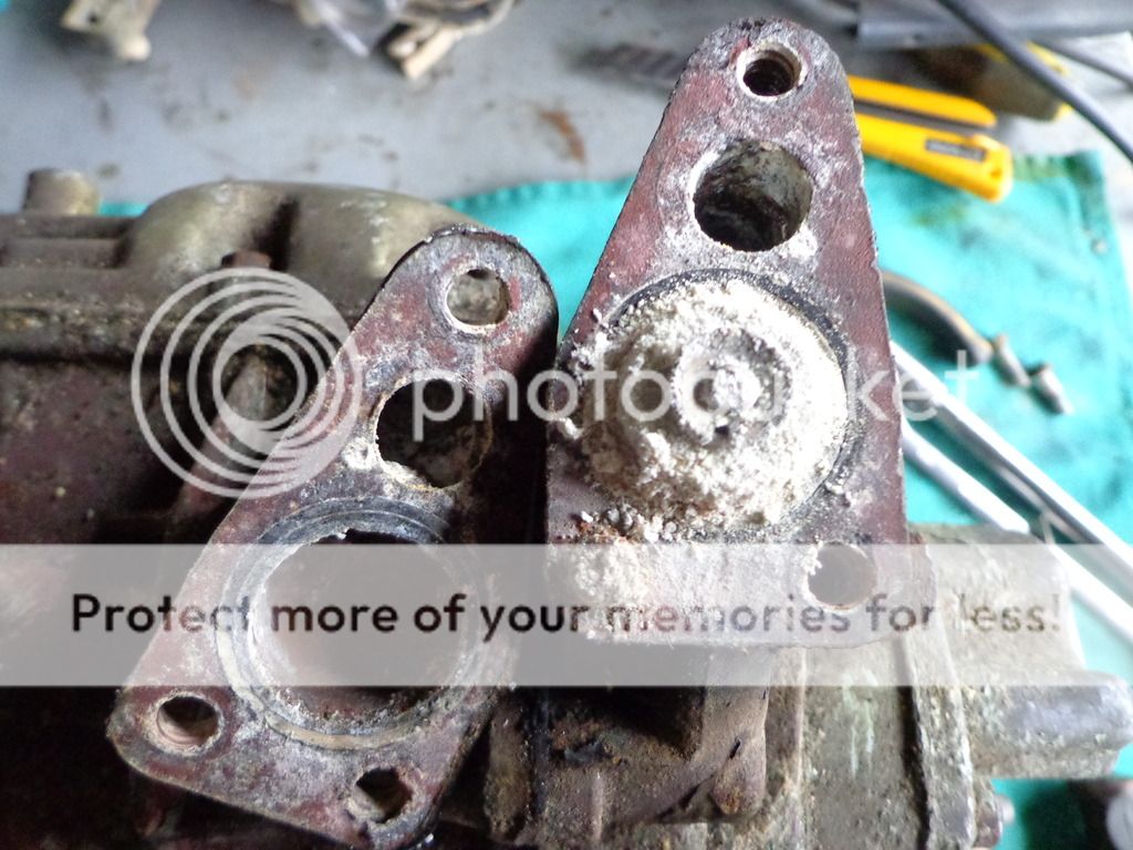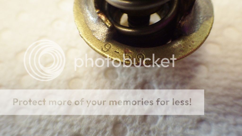 Today I removed the thermostat out of the ’60 Evinrude Lark with the scored cylinder walls I had posted earlier and guess what I found. First, as expected, a bunch of salt corrosion.