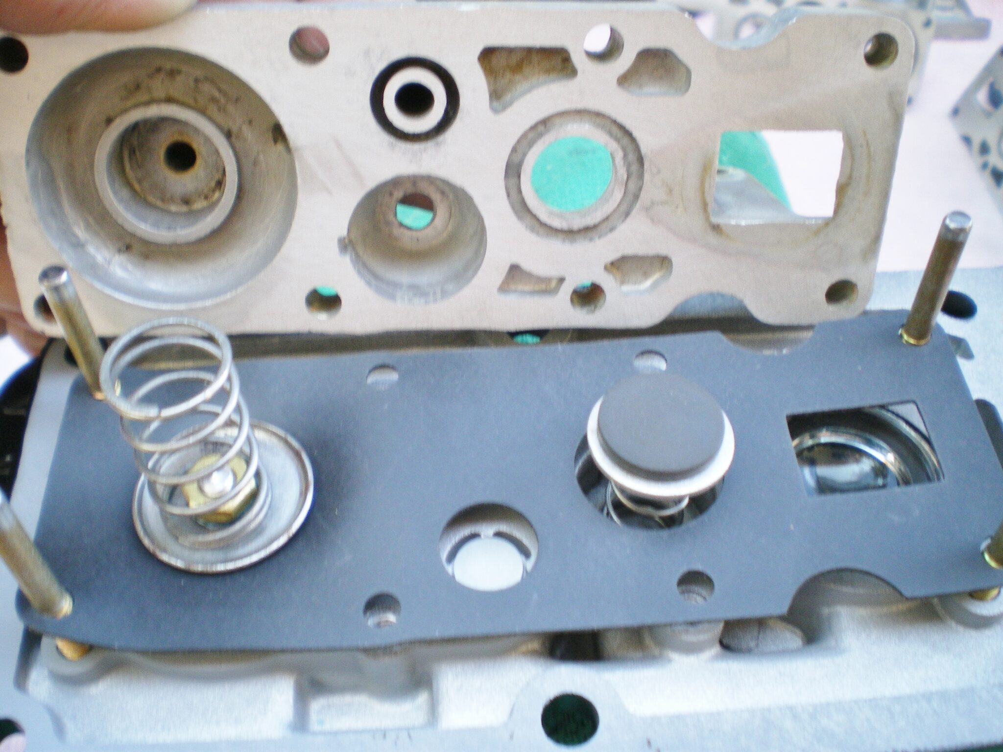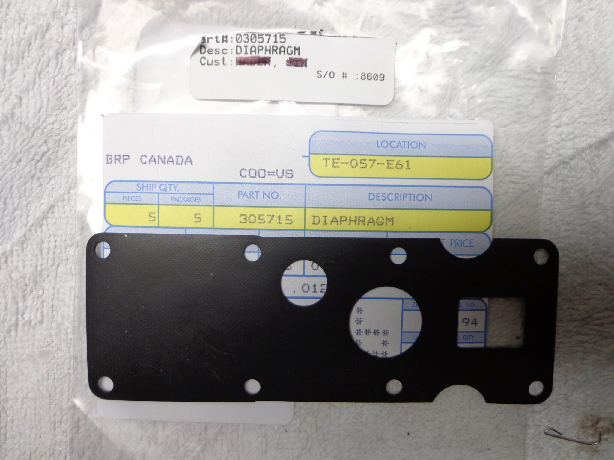 Somewhere around ’57 or ’58 OMC switched from the aluminum primer button to the larger plastic button. If you are using the later diaphragm in the earlier tank, you will have to punch a small hole in it for the aluminum button to go thru. With this design, you should also use a fuel proof sealer of some kind on the cup washers and threads of the button to prevent fuel from leaking thru. The sign of a leak is fuel mix coming out from around the button when it is being pushed. Some 10-24 screws with the heads cut off can be used to help keep everything in alignment when reassembling.