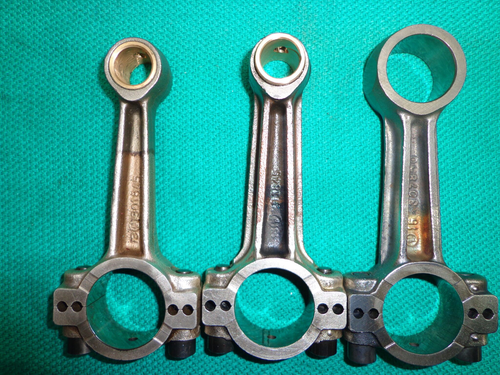 ’57 rod on the left with the standard bushing, ’59 rod in the middle with the wider bushing, ’61 and later rod on the right with the improved wrist pin design.