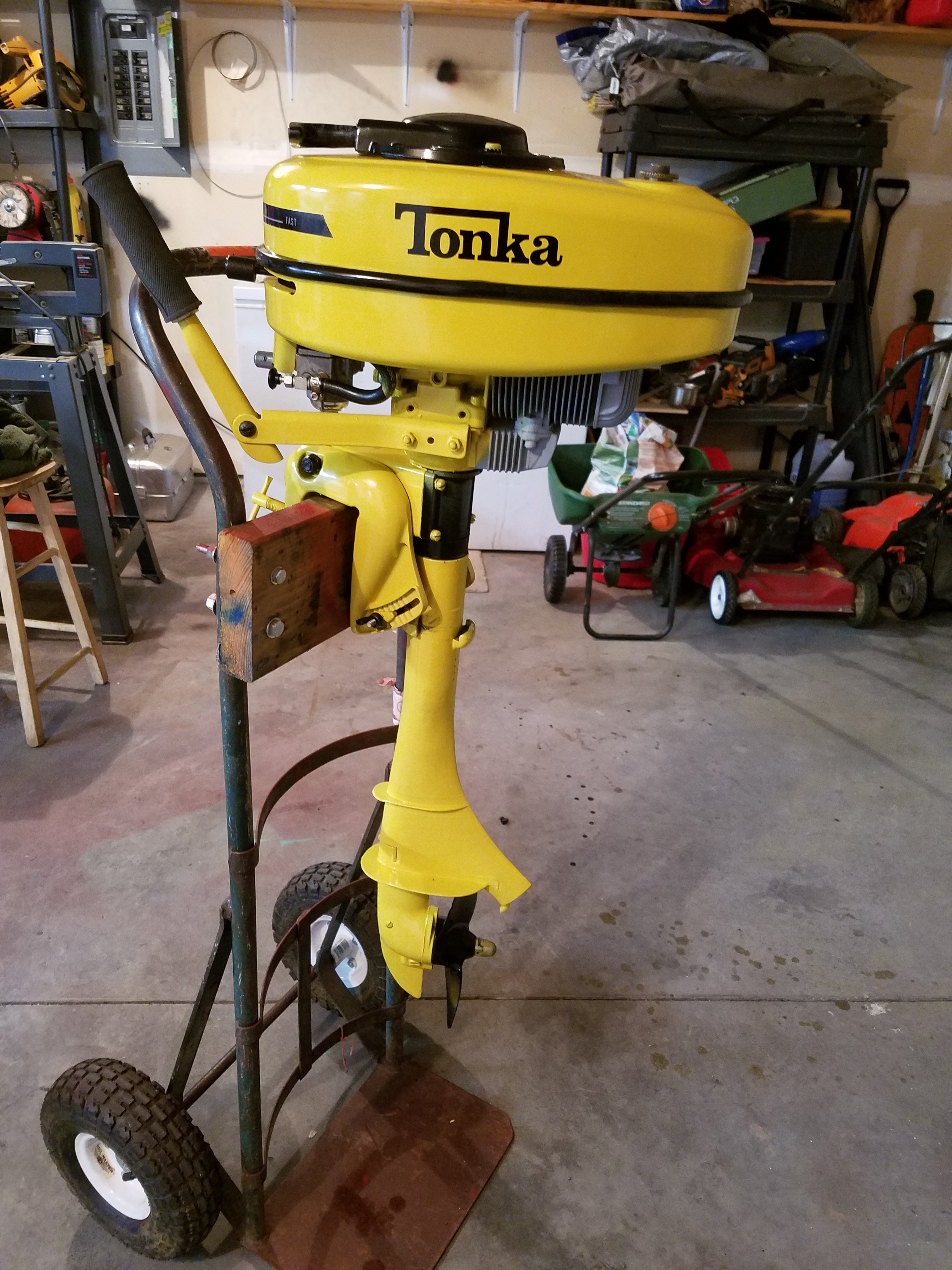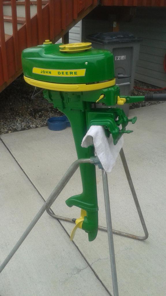 The Massey Ferguson outboard is actually a 1951 Elgin 6hp. When I repair these old Elgins here in Eastern Washington they don’t sell when they have the Elgin green paint job. These youngsters don’t see the coolness in an old outboard like we do. So I give them a paint job that is eye catching and sparks interest. We have a lot of farmers around here and I have sold a couple of John Deere outboards. I was just given three more outboards so let the fun begin.