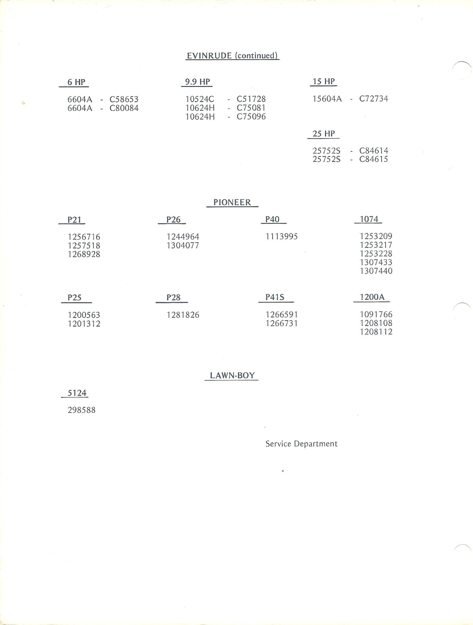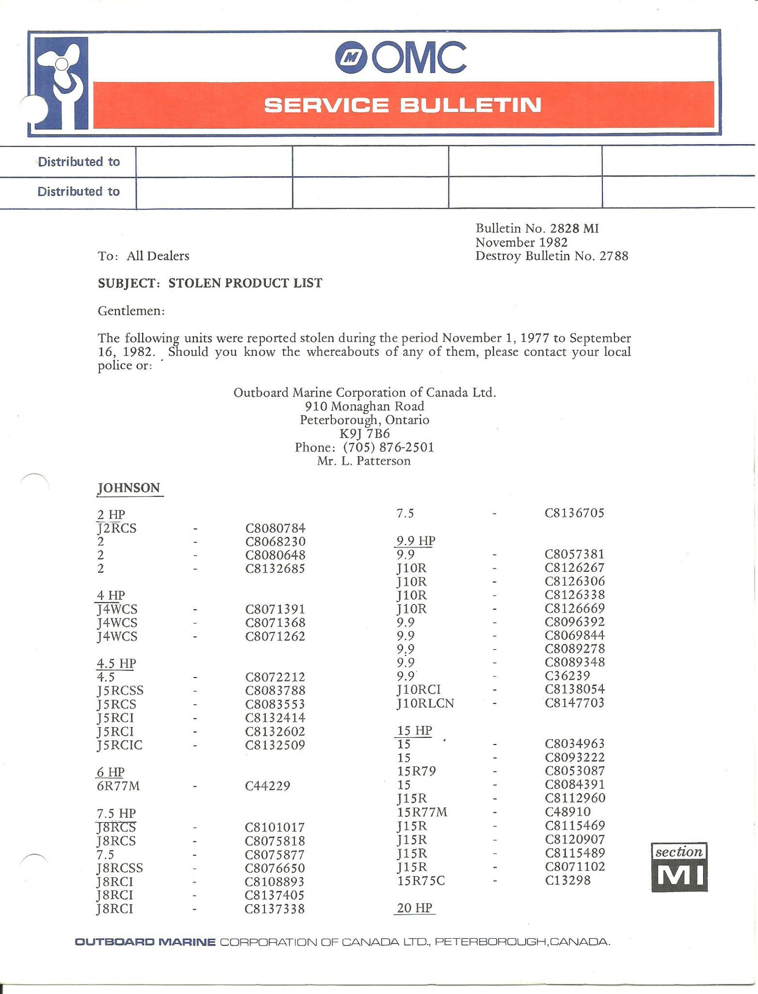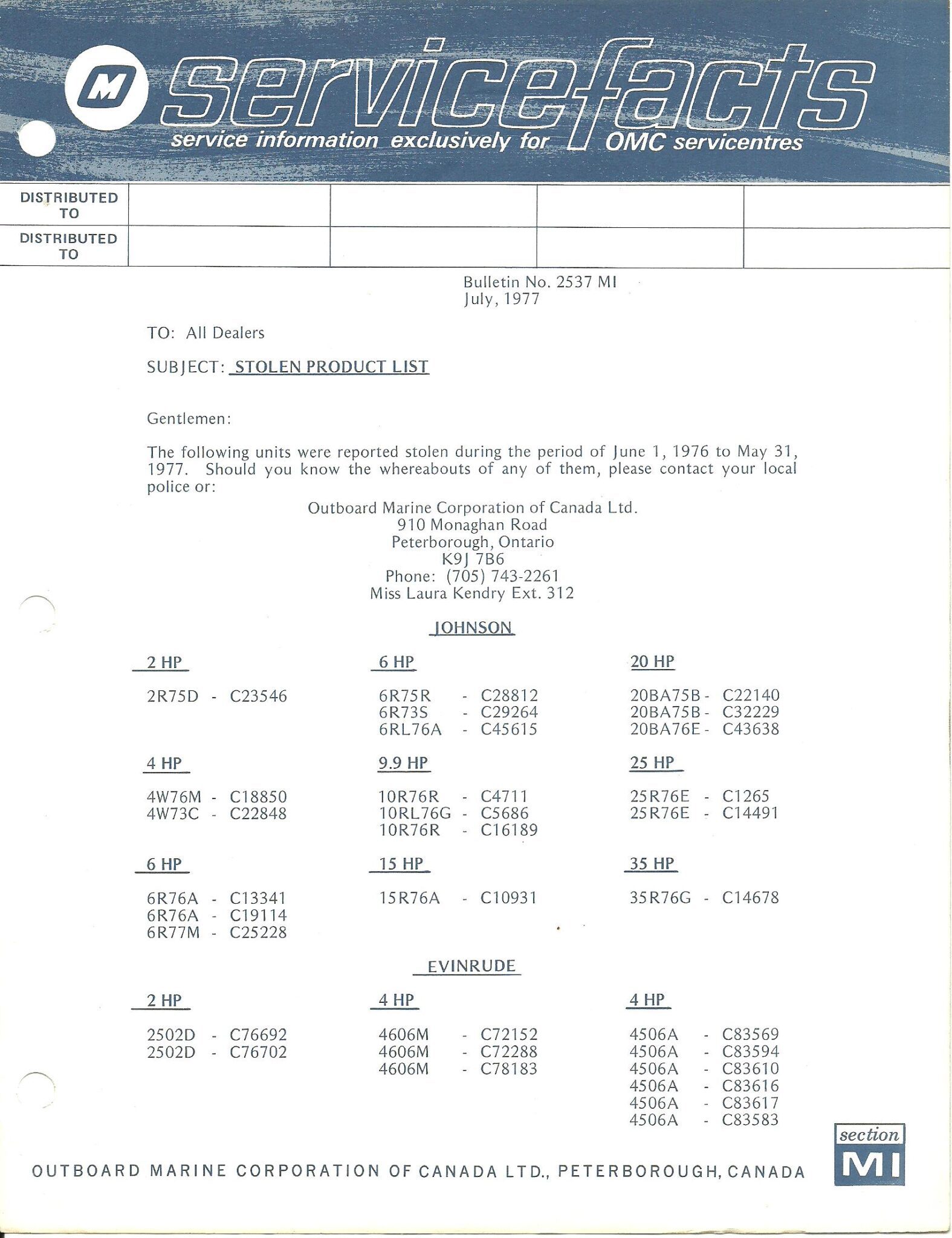 OMC would periodically send its dealers lists of motors which had been reported stolen and ask them to keep an eye open for any which may come into their shops. The lists would include other OMC products to, such as Lawn-Boy mowers and Pioneer chainsaws.