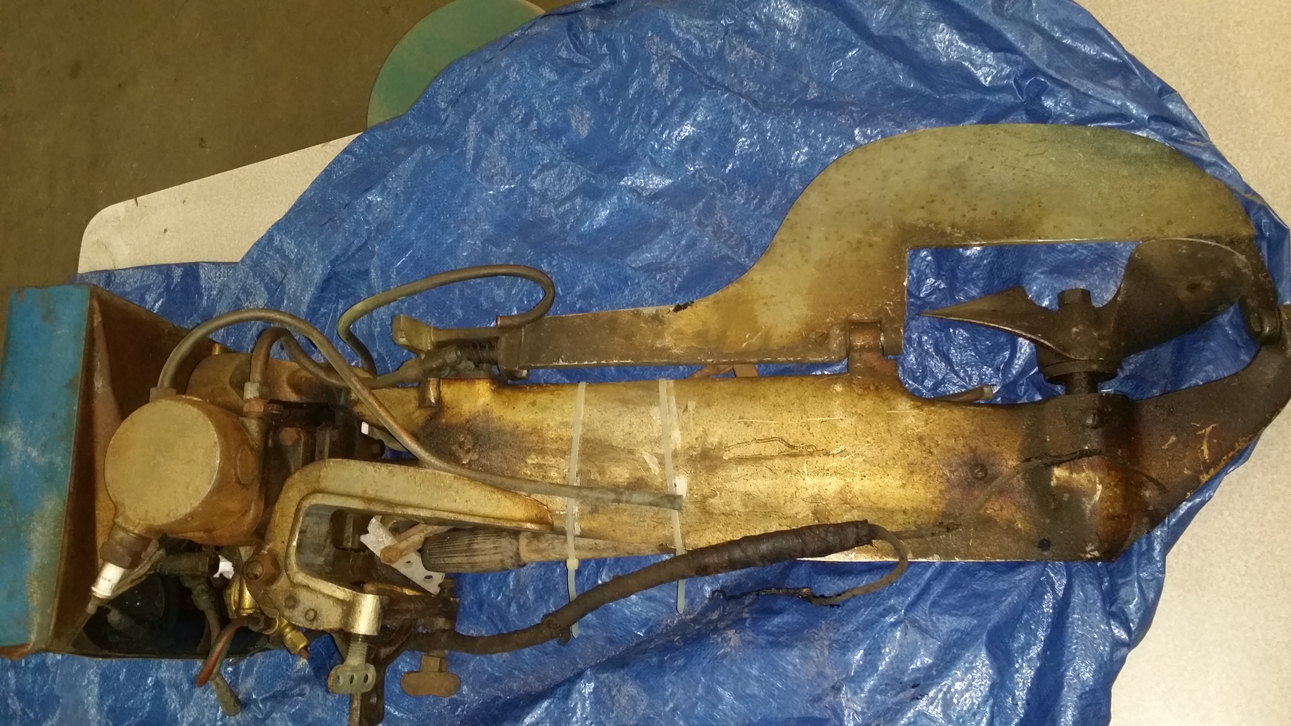 Less than good stuff – there is an obvious non-factory extension fastened to the timer handle. Both transom pads are missing, and the thumbscrew on the starboard side of the motor is a cobbled up replacement for the original. There is a broken piece of aluminum in between the transom clamps and it needs to be determined as to exactly what that might be for. The propeller is not seated in the proper position on the prop shaft, and it needs to be determined as to why. The original aluminum propeller nut has been replaced with one of steel. There appears to be what is a tiller handle zip-tied to the motor leg, and these motors did not come with a tiller handle, they were rope-steered. the tank has been dinged in and shows obvious signs of rust, which is not at all uncommon for these outboards with their thin-wall sheet metal tanks.