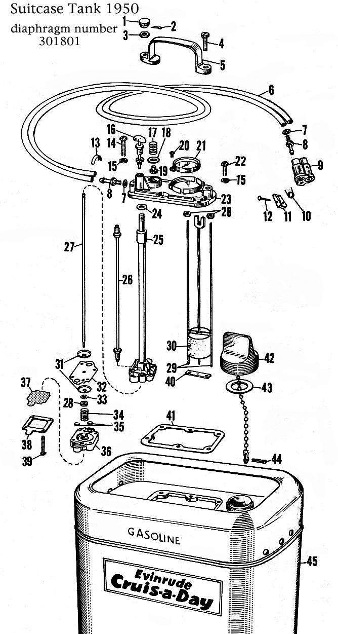 July 1, 2015 at 2:56 am #19272quote :Could you provide a little background on how this fuel system works? If there’s a (pump?) diaphragm in the tank, why would the tank need to be sealed for pressure – doesn’t it simply draw fuel from the tank, up to the motor?The OMC pressure tank system did not have a fuel pump as such. It incorporated an air line off the crankcase that pressurized the fuel tank to 4-6psi forcing the fuel out of the tank and up to the motor through a hose that had a fuel and air line. This system was used (as I noted above) starting in 1949 and ran through 1959-60 – there were some modifications and updates throughout the years.