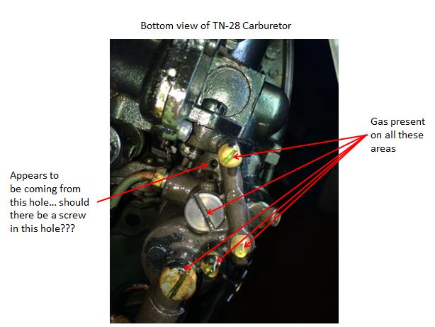 I have a carb for a TN-28 that I recently purchased and the carb is leaking like crazy. All of the screws appear to be seated correctly the only passage that I have noticed is in the image below. There is gas leaking out of it, but I am not sure if a screw was not replaced or if this is a vent of some sort and flooding may be occurring. Would this still flood with the fuel turned of? I would love some input to get this motor back and running.