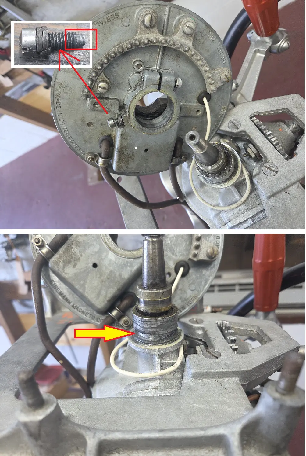 The other screw, if it hasn’t been lost, should look like this. The end is meant to be in the grove on the main bearing to keep the magneto plate from lifting. Notice how mine has two lock washers to keep it from going in too far and locking up the magneto plate, but still in far enough that magneto plate it can’t move up.