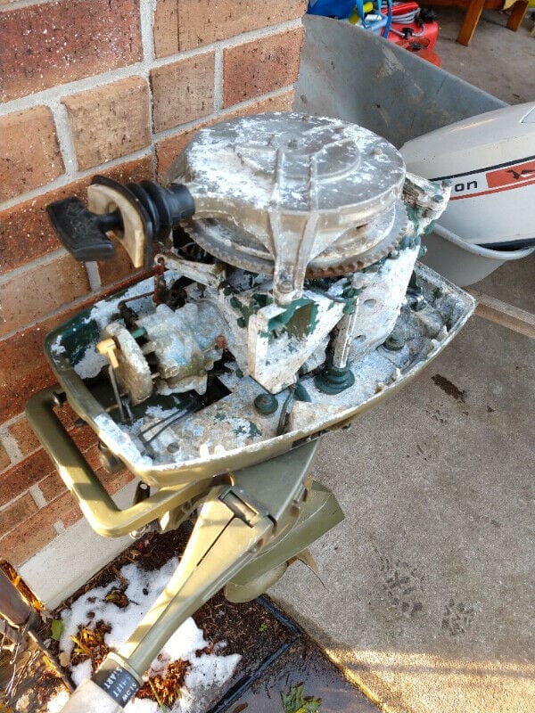 I am new to this forum. I am not sure my outboard is old enough to be in this Antique site. I picked up an old and beat up 1973 20 Hp Johnson (the first picture) and want to restore it.I have taken a part the power head and rehone the cylinder, both of them got 115/113 psi. The block has been sand blasted and paint back base color. So far I got done step #1.