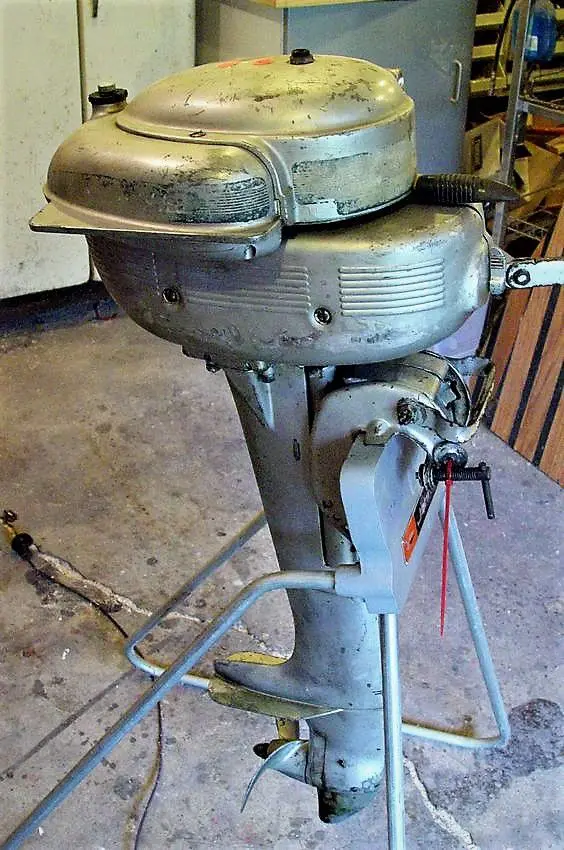 I have this small motor which was a roadside find in Snowmass, CO. Single cylinder, probably 2.5 or 3 HP (seems bigger than 1.5HP), cast aluminum 2 piece tank, separate fuel shut off under the tank, (not integral with the carb), pressed steel carry handle (not cast aluminum), silver/aluminum paint without any recognizable decal, ID plate missing from front of transom clamp. The only stamped number on it is on the freeze plug on front of crankcase, behind carb, 0067217.